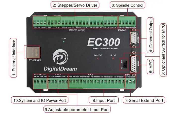 Поддержка 5 осей. Максимальная выходная частота 300 кГц/ось; Подключение Ethernet с программным обеспечением Mach 3; Основной источник питания 24В постоянного тока, ток должен превышать 1А; IO Power-24VDC источник питания, ток должен ВЫШЕ 1А (контроллер уже поставляет питание для порта IO, больше не нужен внешний источник питания для порта IO); 12 оптически изолированных цифровых входных портов, 10 оптически изолированных цифровых выходных портов; 1 аналоговый выходной порт 0-10 В Регулируемая скорость для шпинделя (можно изменить на PWM выходной порт); Рычаг управления движением, два релейных выхода; Он совместим со стандартным MPG, а также цифровым MPG Dream
