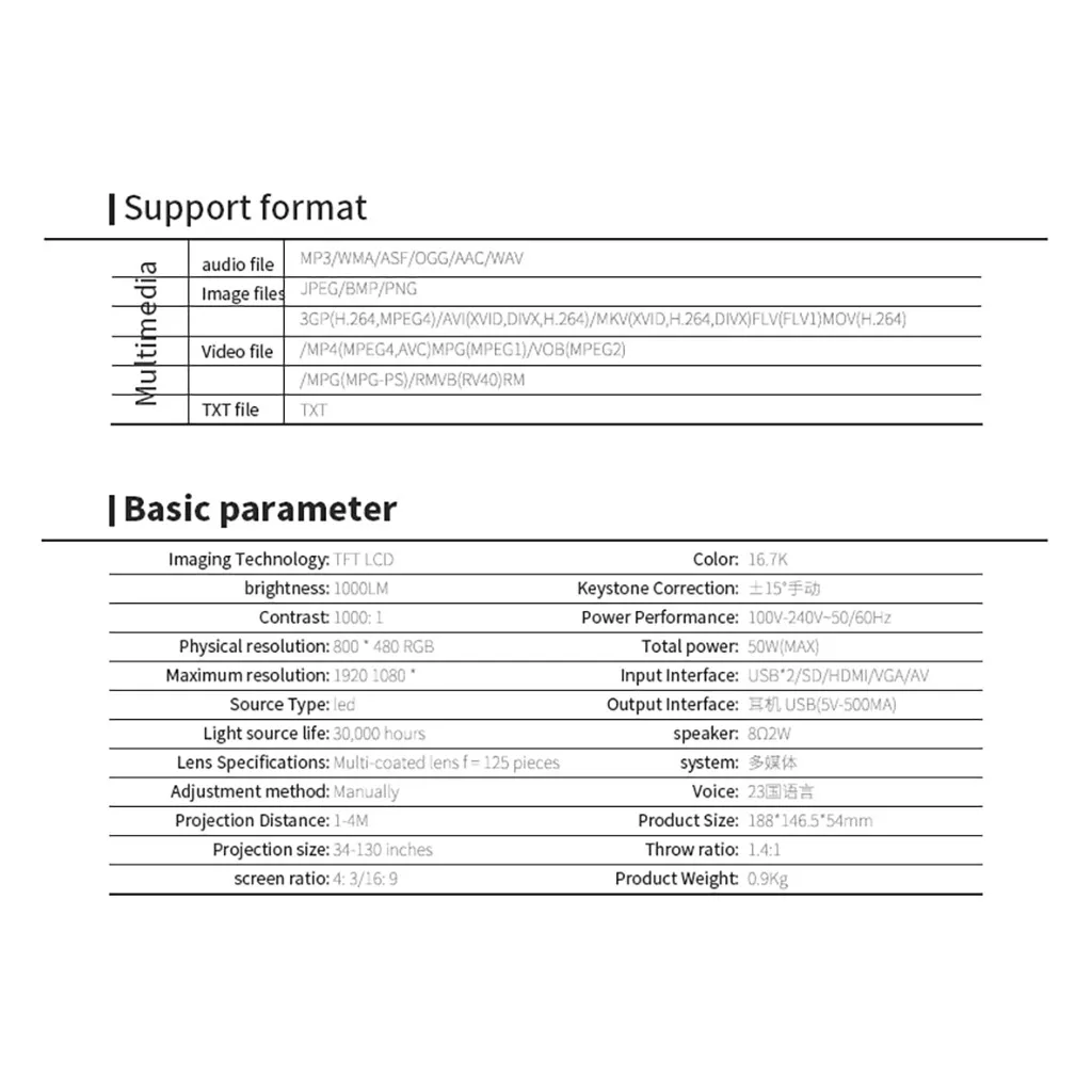 Технология изображения: TFT LCDЯркость: 5000 люменКонтрастность: 2000:1Оригинальное Разрешение: 800*480Поддерживается: 1920*1080Светильник источник света: светодиодныйСветодиодный срок службы: 30000 часовОбъектив: f = 125 ммРежим фокусировки: ручная работаРасстояние проекции: 1-4 мРазмер проекции: 34-130 ДюймовСоотношение экрана: 4:3, 16:9Проекционное отношение: 1,4: 1Цвет: 16770KKeystone: ± 15 ° ручная коррекцияМощность: 220 В/2,5 А, 5 В/2 АМощность: 50 Вт (макс.)Вход: USB, цифровая карта памяти безопасности, VGA, HDMI, AVВыходной интерфейс: 3,5 мм AUX Jack, USB (5 В)Динамик: 2 Вт * 1Поддержка системы: мультимедиа (музыка, изображение, видео, TXT)Поддержка языков: 23 языка sДругие: глобальная клавиатура, дистанционное управлениеУпаковка pureglas