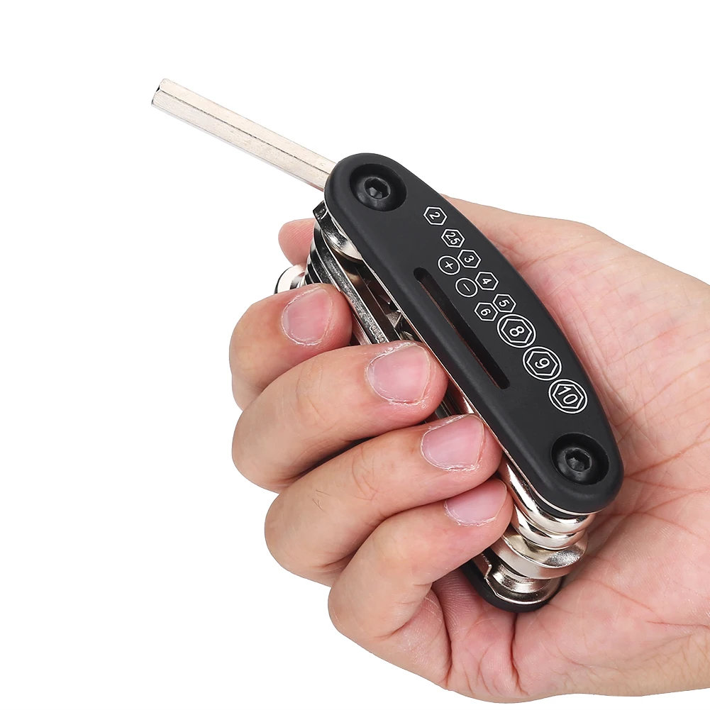 16 в 1 набор инструментов: 2/2.5/3/4/5/6 мм, инструкция по эксплуатации на шестигранные ключи, 8/9/10 мм гнездо, инструкция по эксплуатации на шестигранные ключи, 8/10/15 мм гаечный ключ с открытым зевом инструменты для рыбалки, отвертка с плоской головкой, 14G спицевый ключ, втулка