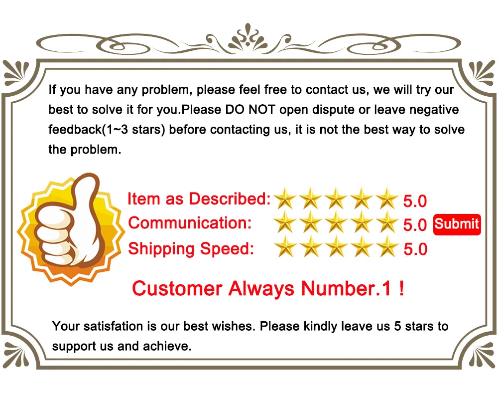 1. Ваше удовлетворение и комментарии очень важны для нас. Если вы удовлетворены нашей продукцией и обслуживанием, пожалуйста, оставьте нам 5 звезд и положительные отзывы, чтобы поддержать нас и добиться беспроигрышного.