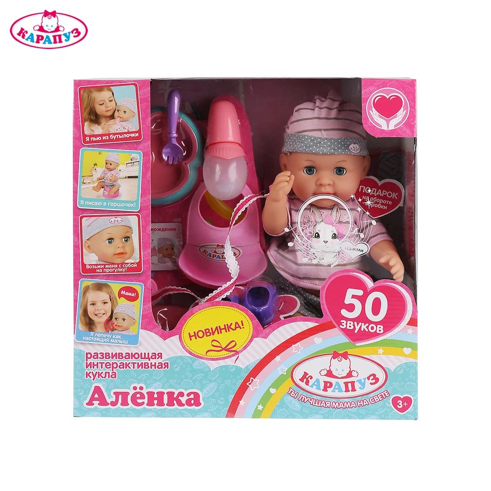 Вместе с куколкой Алёнкой ТМ «Карапуз» девочка почувствует себя лучшей на свете мамой. Игра с такой оригинальной игрушкой-куклой учит девочек проявлять заботу, любовь и внимание, развивает социально-коммуникативные навыки, речь, моторику, воображение и фантазию ребёнка.