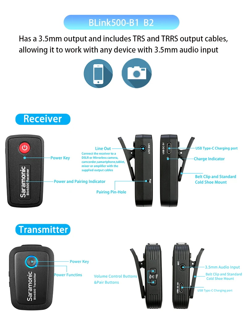 Saramonic мигать 500 является невероятно легкий, ультракомпактный и простой в использовании 2-х местный Беспроводная микрофонная система для цифровых зеркальных однообъективных камер, беззеркальных фото-и видеокамеры, или мобильных устройств, которые обеспечивают детальное качество трансляции звука. Серия системы состоит из трех различных приемников. RX Приемник имеет 3,5 мм выход и включает в себя ТРС и TRRS выходной кабели, позволяя ей работать с любым устройством с 3,5 мм аудио вход.