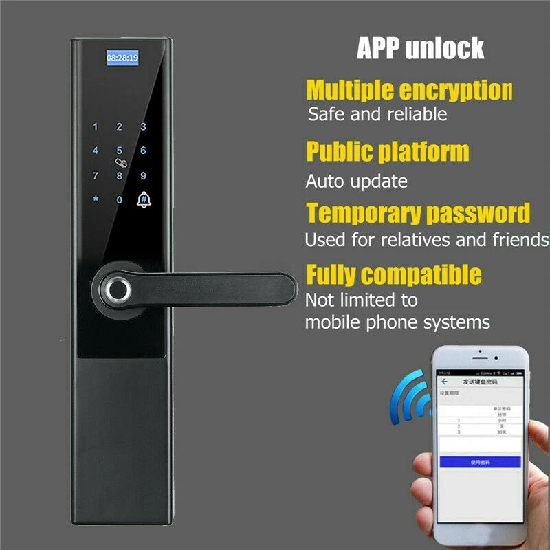 Особенности: 1. 5 способов открыть дверь: разблокировка приложения, разблокировка отпечатков пальцев, разблокировка паролем, проведите пальцем, чтобы разблокировать, ключ для разблокировки. 2. Предотвращает вставку и открытие железного предмета, И спроектируйте слой внешней кольцевой оболочки на положении вала сцепления продукта, чтобы предотвратить незаконные элементы от вставки и блокировки сцепления железным предметом.