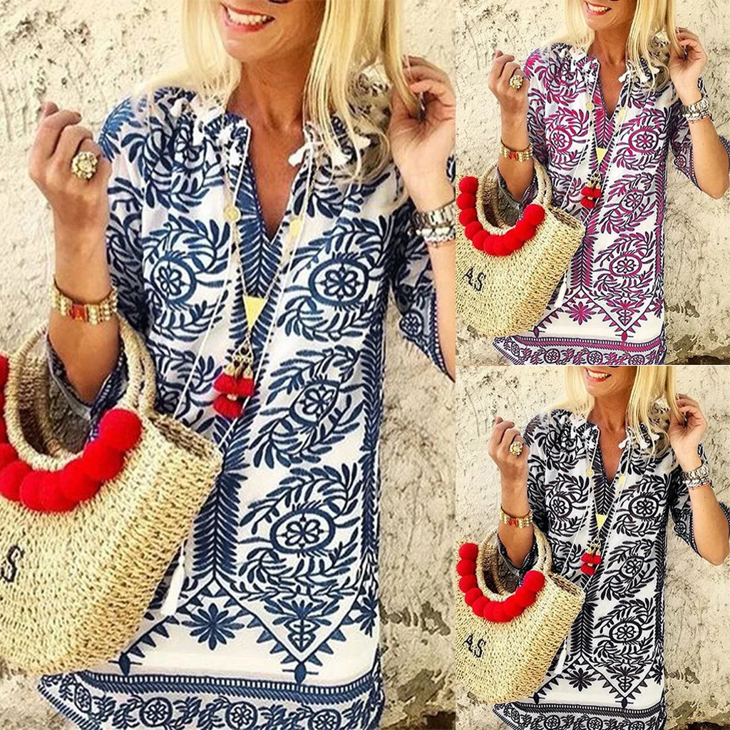 Женская летняя блузка с v-образным вырезом и этническим принтом, свободная Длинная блузка с коротким рукавом, повседневные блузы, Женские топы и блузки, 2019