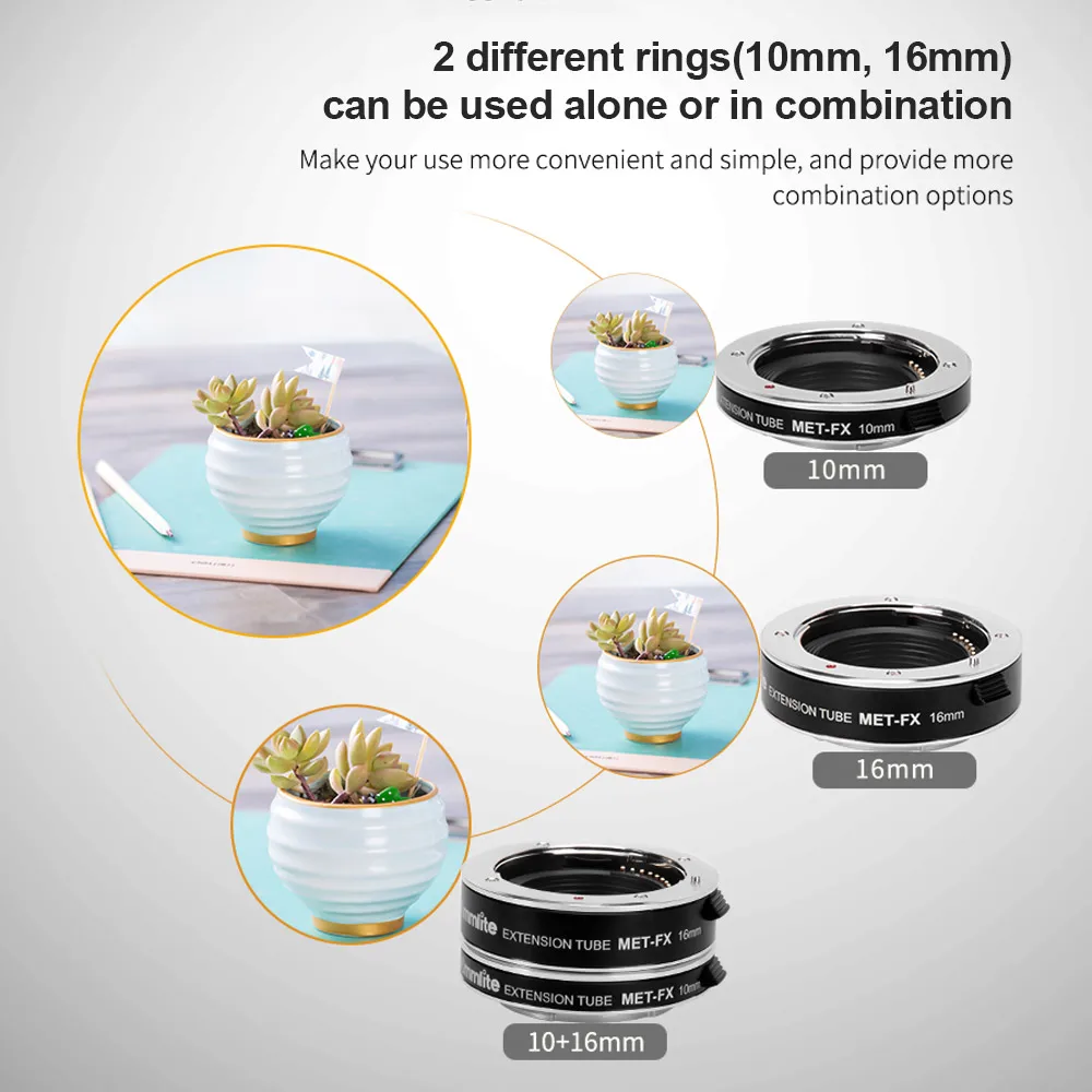 Автоматическая удлинительная трубка для камеры и объектива Fujifilm X-Mount состоит из двух различных колец (10 мм, 16 мм), которые могут быть использованы отдельно или объединены для удовлетворения ваших потребностей для различного увеличения крупным планом. Коннектор разработан с использованием новых электронных технологий, которые помогут вам достичь автофокуса и функций экспозиции TTL. Это прекрасный партнер для Fujifilm X-Mount lens и камеры, используемые для макросъемки.