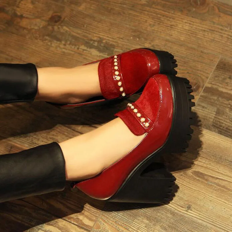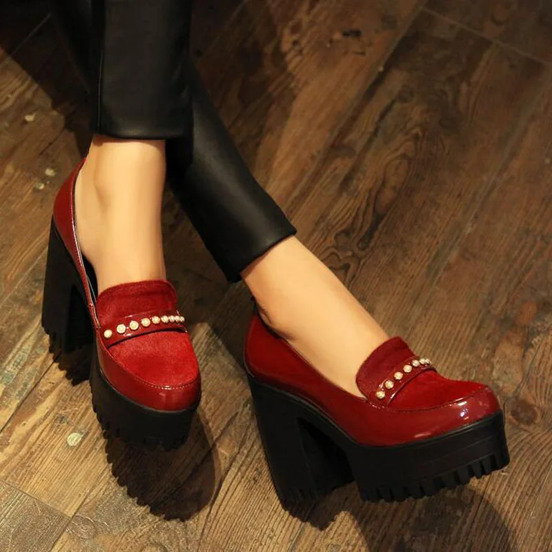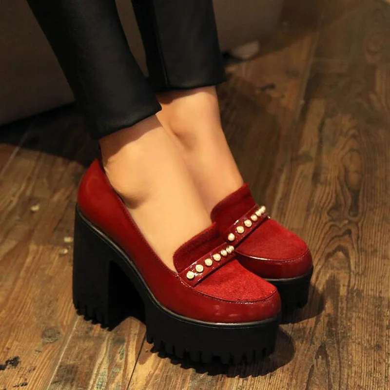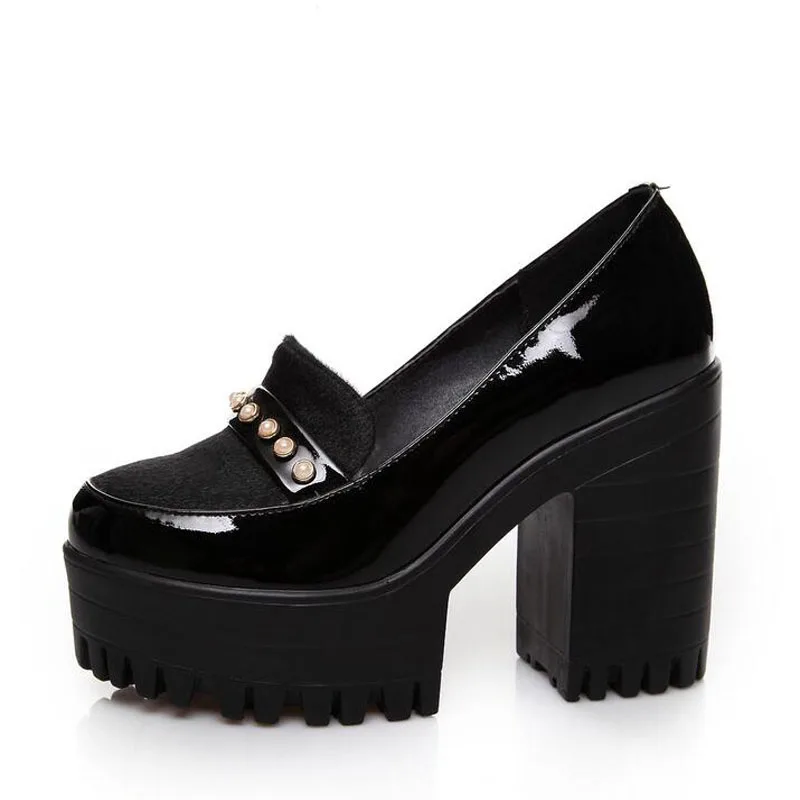 Качественные туфли-лодочки на платформе из натуральной кожи с жемчугом и конским мехом; Цвет фиолетовый; Женские модельные туфли на высоком каблуке 11 см; Цвет красный, черный, T11-5