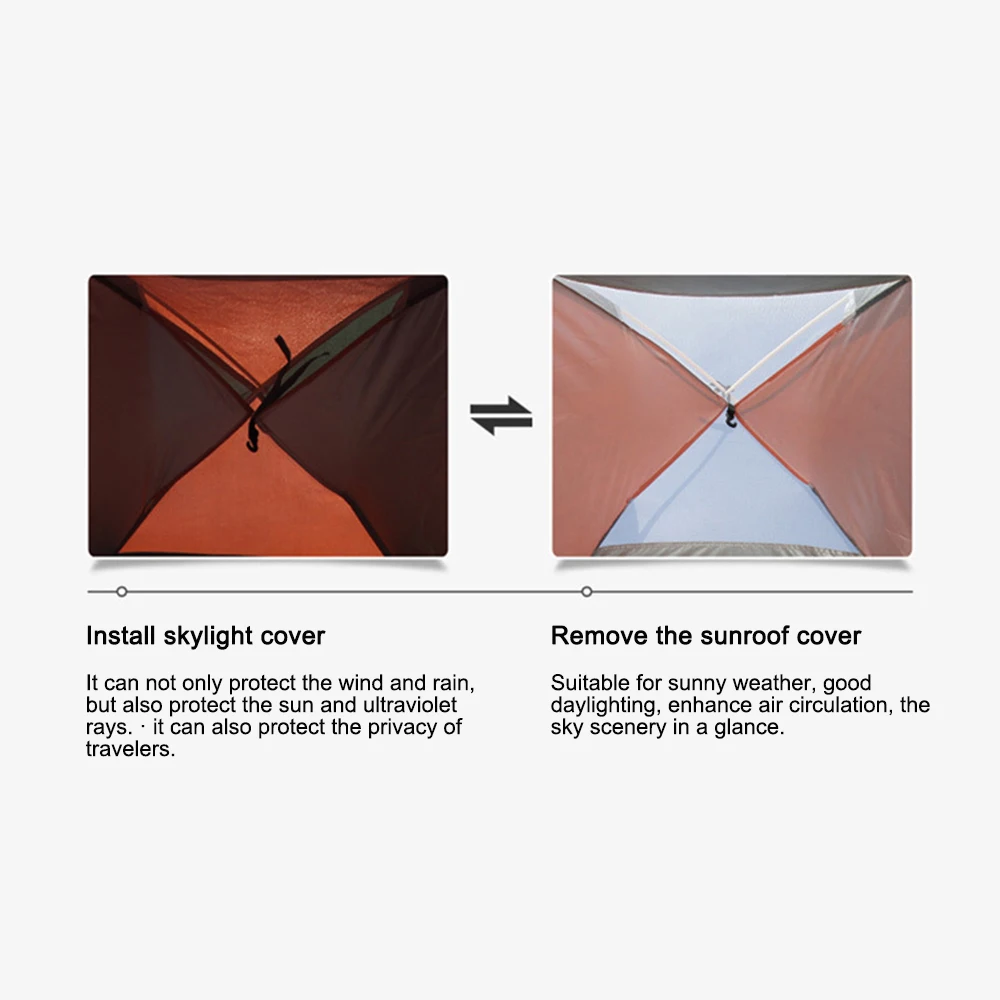 Дышащая панорамная конструкция окна экрана значительно увеличивает воздухопроницаемость палатки, уменьшает знойный нагрев и имеет сильный светильник передачи и увеличивает внутреннюю яркость.