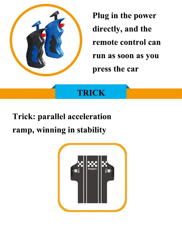 2. Электрический режим управления, тип сборки пазлов. Красивые модели, крутые передние и задние фонари. Точная функция записи круга может получить, кто может закончить раунд быстрее и выиграть более точно. Высокое качество супер сильный генератор, непрерывный источник питания, позволит вам лучше наслаждаться удовольствие от непрерывных гонок; Электронное управление: Устранение усталого ручного движения, прямое подключение источника питания, играть больше удовольствия!