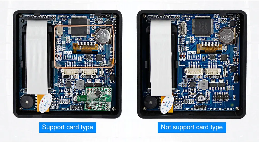 Есть версия на ваш выбор. FR500 Модель:Не поддерживает функцию считывания карт. Не может поддерживать, чтобы открыть дверь, проводя карточку. FR500D Модель:С функцией считывания RFID. Работа с частотой 125 кГц. FR500C Модель:С функцией считывания RFID. Работает с частотой 13,56 МГц.