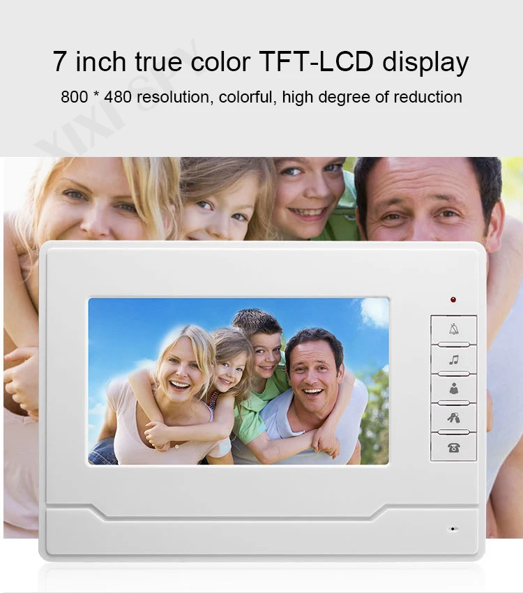 Введение функции: видеодомофон с хостом, разблокировка, монитор, не беспокоить, домофон Дисплей: G12TFT-ЖК-дисплей 7-дюймовая цифровая HD ЖК-дисплей Дисплей Разрешение: 800*480 Источник питания: Входное напряжение: 100 В-240 В переменного тока, выходное напряжение: 15 В постоянного тока 1,5 А Потребляемая мощность: режим ожидания ≤ 1 Вт, работа ≤ 10 Вт Мелодии звонка: 25 песен гармонии Размер внешнего вида: длина 230 * Ширина 165 * толщина 20 мм Материал: АБС-пластик Вес: 0,7 кг