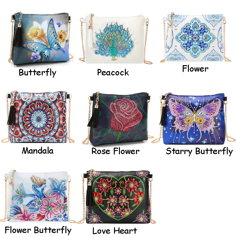 Тип 1: алмазная живопись Тип 2: сумка через плечо Материал: стразы из смолы + кожа Тип алмаза: алмаз особой формы Размеры: 18x1 5 см/7,09x5,91" Длина цепочки: 120 см/47,25" Стиль: Бабочка, павлин, цветок, мандала, цветок розы, ЗВЕЗДНАЯ бабочка, Цветочная бабочка, любящее сердце