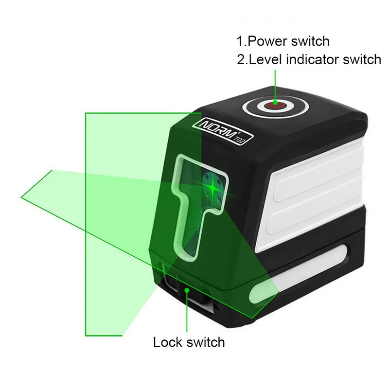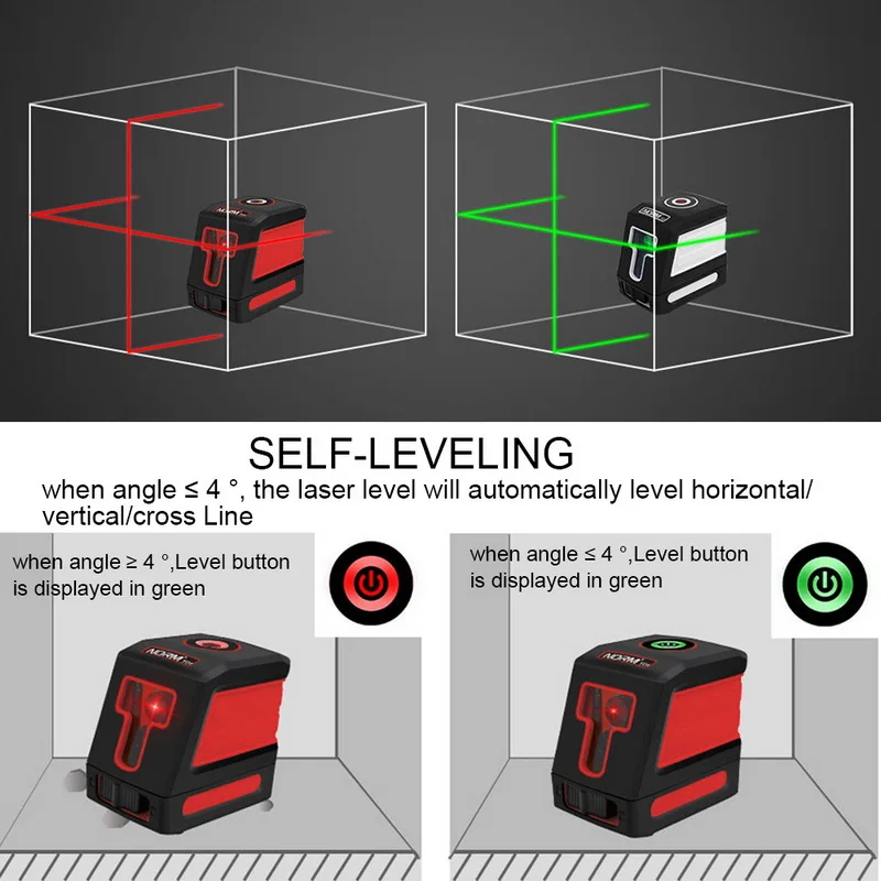 ** Самонивелирующийся: особенности самонивелирующийся в пределах 4 °, когда угол ≤ 4 °, лазерный уровень автоматически выравнивает горизонтальный/вертикальный/поперечный, В противном случае лазер будет зеленый свет, чтобы указать состояние вне уровня.