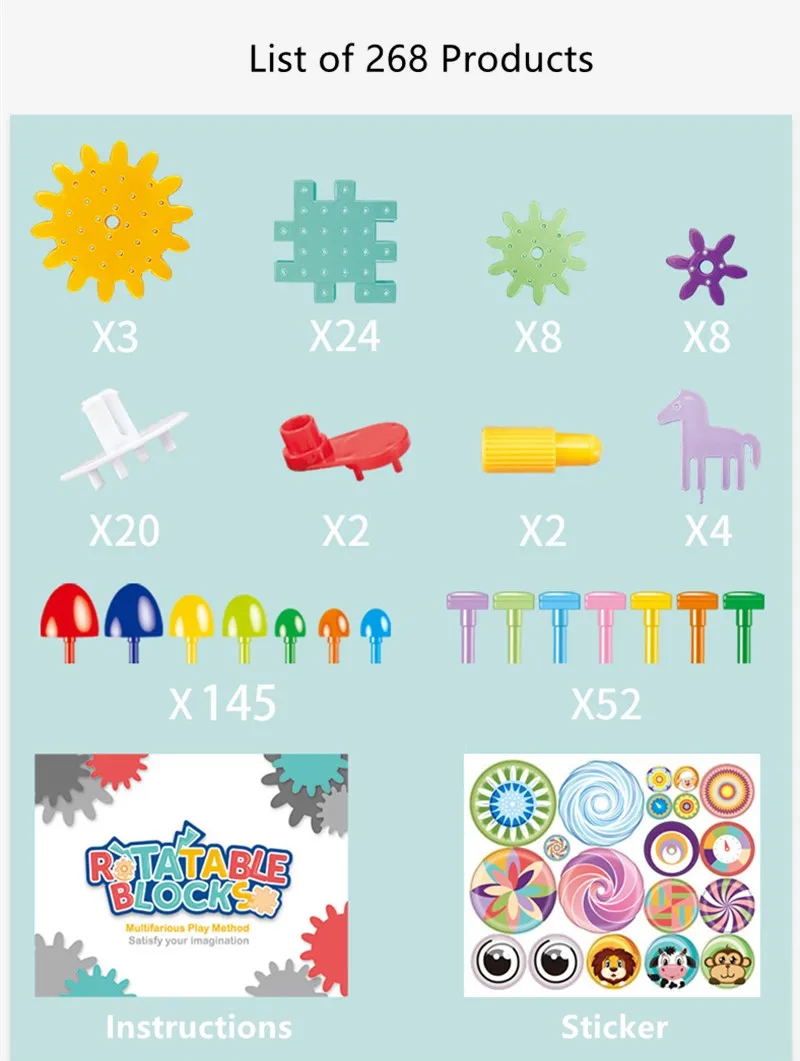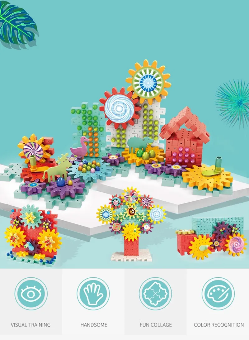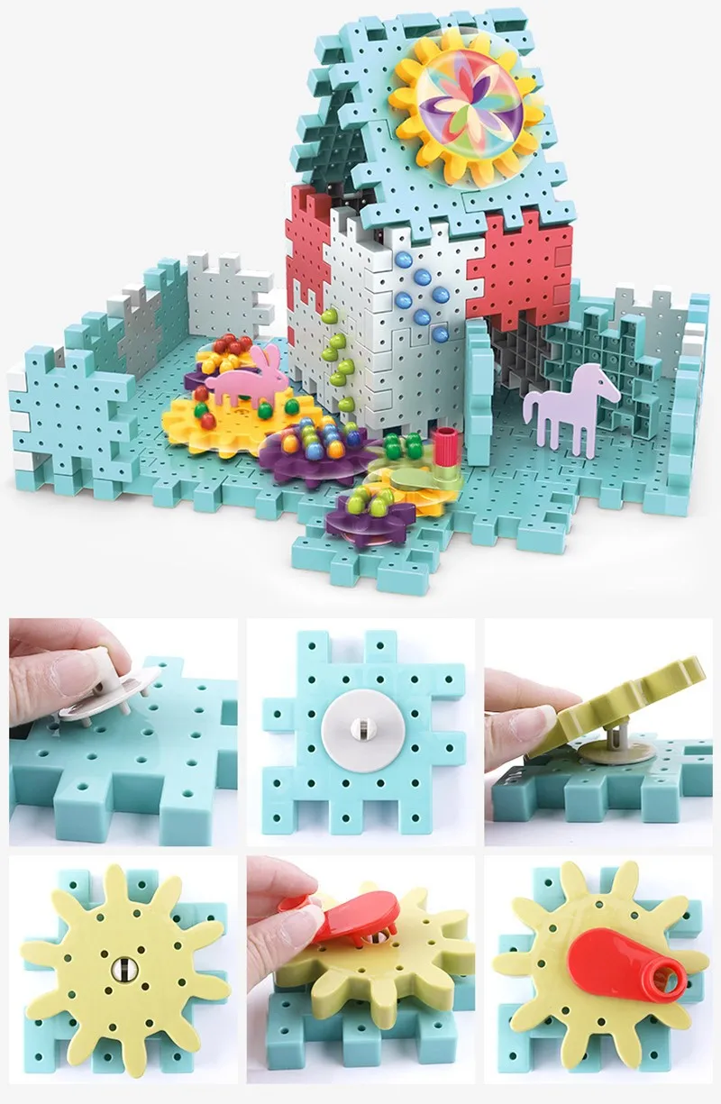 Забавно смешивать и сочетать по желанию, чтобы создать богатую сцену. Шестерни прилипают друг к другу. Один ход может управлять всей картинкой