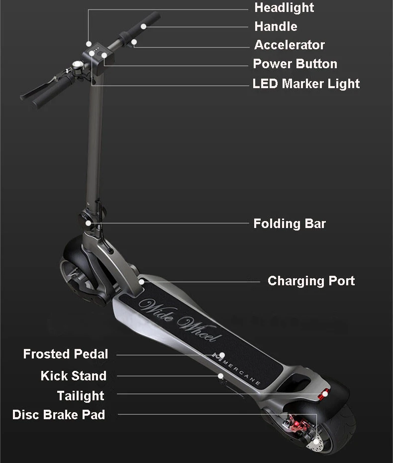 Технические характеристики Размер шин: 8 дюймов Материал: алюминиевый сплав + непневматическая шина Модель: S-lite, S-pro, Duo-extreme, Duo-ultimate Цвет: черный Мощность двигателя: 500 Вт бесщеточный двигатель Максимальная скорость: одиночный двигатель 35 км/ч, двойной двигатель 45 км/ч (после ограничения скорости) Напряжение: 48 в Время зарядки: около 6-8 ч Вес нетто: 18 кг Максимальная нагрузка: 100 кг Размер расширения: 110*55*110 см Размер складывания: 110*22*41 см Умные электрические скутеры Mercane WideWheel, последняя версия 2019 в наличии сейчас! 1. Функция активации нового ключа может предотвратить запуск автомобиля по желанию других. 2. Новый дисплей напряжения может четко видеть оставшуюся мощность. 3. Общая рама обновлена, более прочная и прочная Посылка содержит Название продукта: электрический самокат Widewheel Посылка содержит: -Электрический скутер * 1 -Зарядное устройство * 1 -Руководство пользователя * 1 О снятии ограничения скорости Заводская Скорость этого скутера составляет 20 км/ч, после ограничения скорости, версия одного мотора может достигать максимальной скорости около 30-35 км/ч; двухмоторная версия может достигать максимальной скорости около 40-45 км/ч. Внимание, мы можем помочь вам снять ограничение скорости, если вы хотите это сделать, Есть два способа: -Методы A: Отправьте вам видео для руководства, вы можете сделать это самостоятельно. -Методы B: или мы поможем вам удалить ограничение скорости, прежде чем отправить его. (Если вы выбираете этот способ, пожалуйста, свяжитесь с нами)