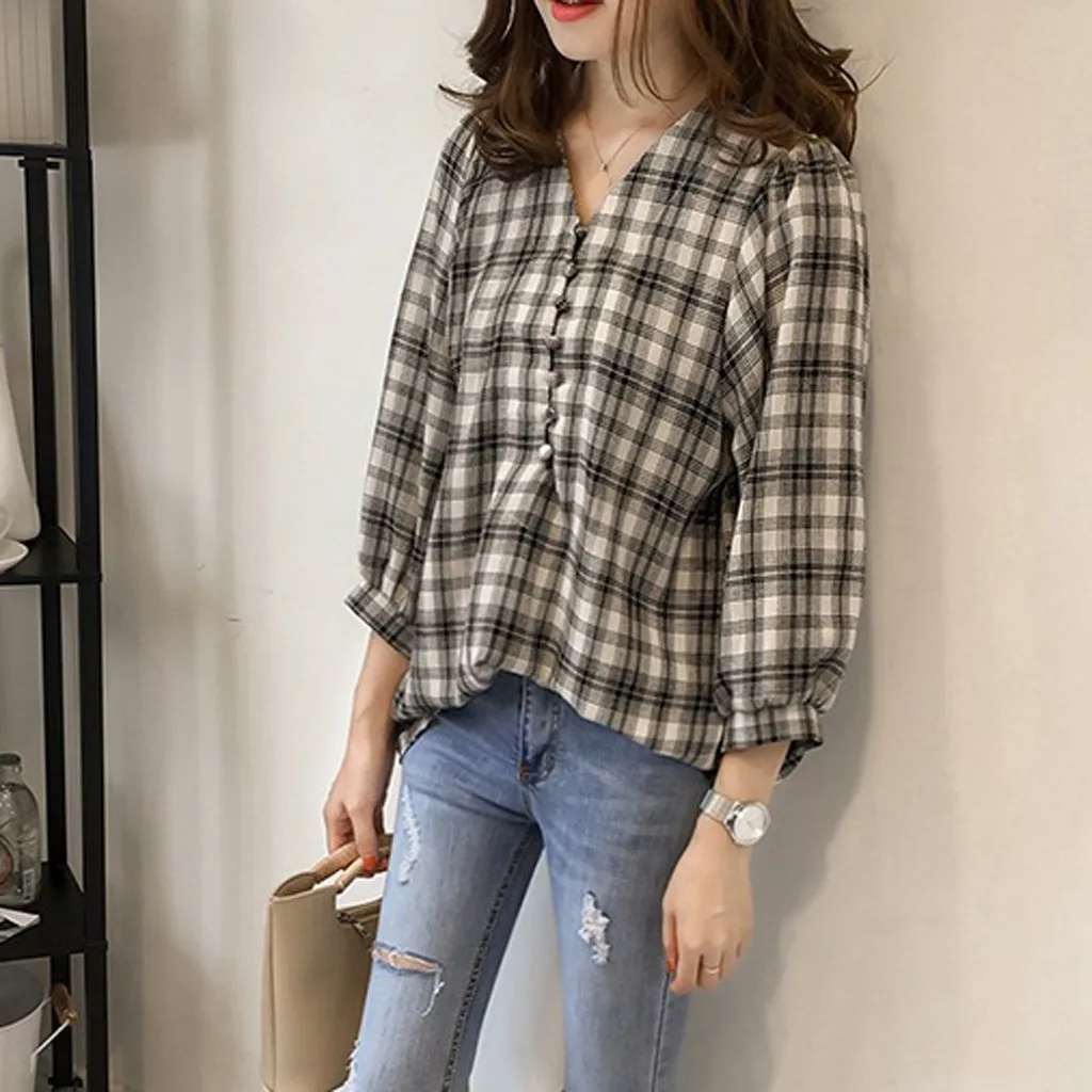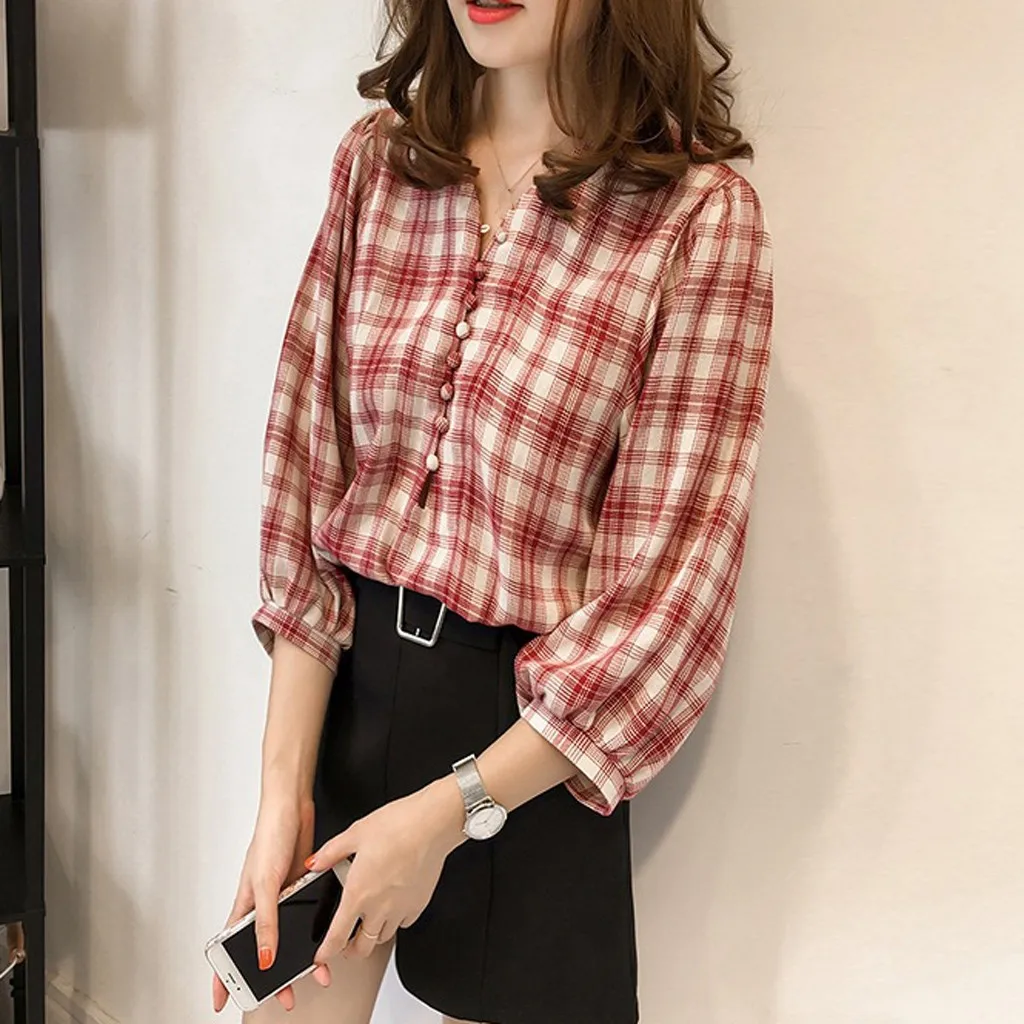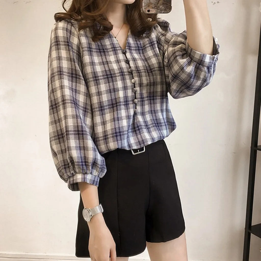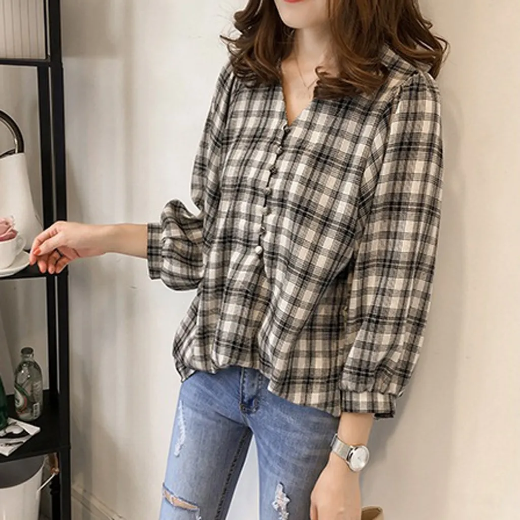 Корейская женская Повседневная блуза с длинным рукавом, милые клетчатые рубашки на пуговицах, топы