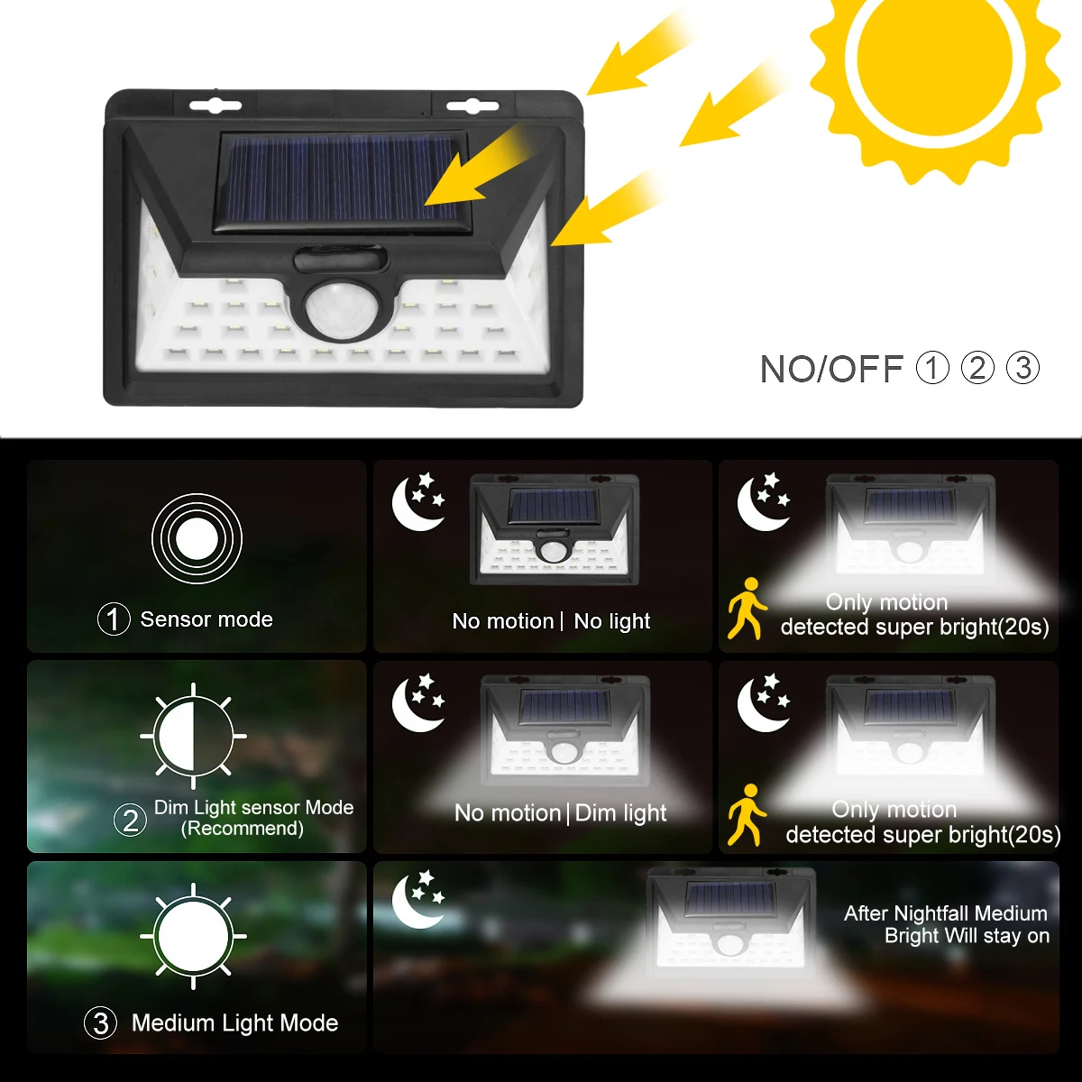 Automatic human induction,In darkness or at night,when motion detected human around 120° and 3-5 meters,the solar motion lights turns on automatically