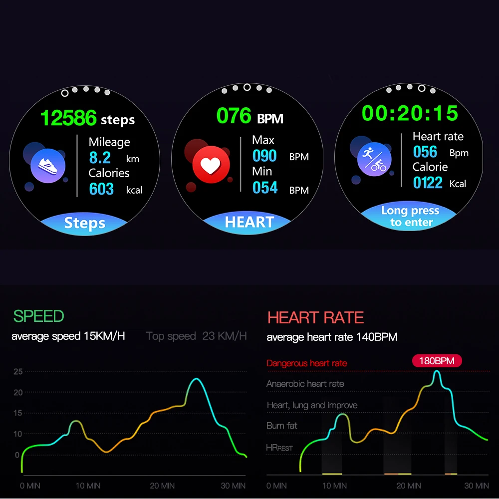 Вспомогательный медицинский помощник или хороший помощник для упражнений:Благодаря включению мониторинга сердца, артериального давления и сна, вы можете легко ухватить свои физические условия. Для упражнений эти часы также идеально подходят для использования. Его функция мониторинга позволяет избежать чрезмерных нагрузок во время занятий спортом; Запись данных в реальном времени (шаги, время и т. д.) и запись упражнений после занятий спортом помогают бодибилдингом.