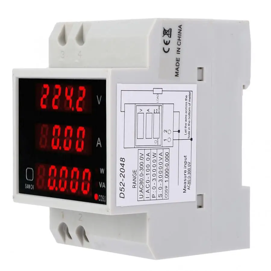 D52-2048 Многофункциональный измеритель рельса цифровой дисплей переменного напряжения тока измеритель коэффициента мощности AC80 ~ 300V 100A