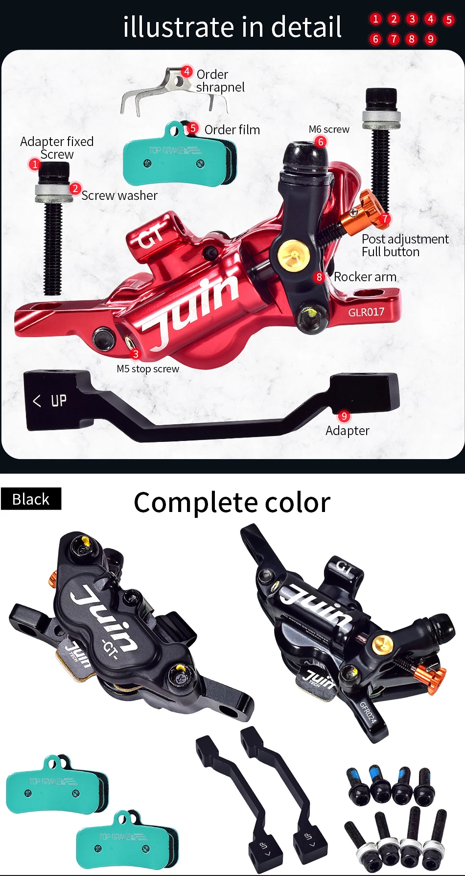 * Обновление от механического кабеля вытяжного дискового тормоза * Улучшенная эффективность торможения с механическими дисковыми тормозами и тормозными суппортами с простыми прокладками и кабелями Регулировка * Тормозные колодки управляются замкнутой гидравлической системой минерального масла с кабелем * GT-P подходит для всех крепежных рам и оснащен крепежными болтами. * Juin tech GT-P имеет отличную производительность торможения и тормозную силу