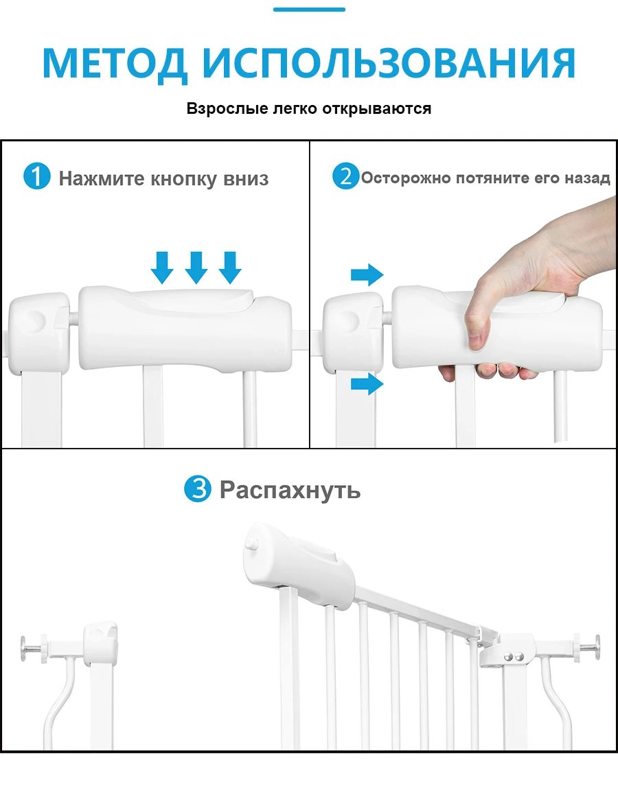 Детские ворота поставляются с 4 регулировочными болтами под давлением для простой и безопасной установки без сверления отверстий. Если механизм защелки слишком короткий, чтобы добраться до замка. Пожалуйста, затяните верхние регулировочные колеса, чтобы сократить зазор, пока зазор между ручкой и защелкой не станет 5 мм. Если слишком туго, чтобы открыться, пожалуйста, ослабьте верхние регулировочные колеса должным образом.