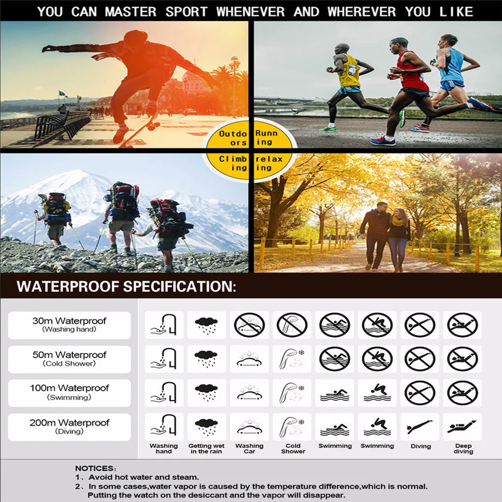 Глубина водонепроницаемости 50 м: Не стесняйтесь носить часы, когда вы мочите под дождем, принимайте душ или Мойте руки. Но не нажимайте кнопки под водой. Также избегайте использования при экстремальной горячей или холодной температуре