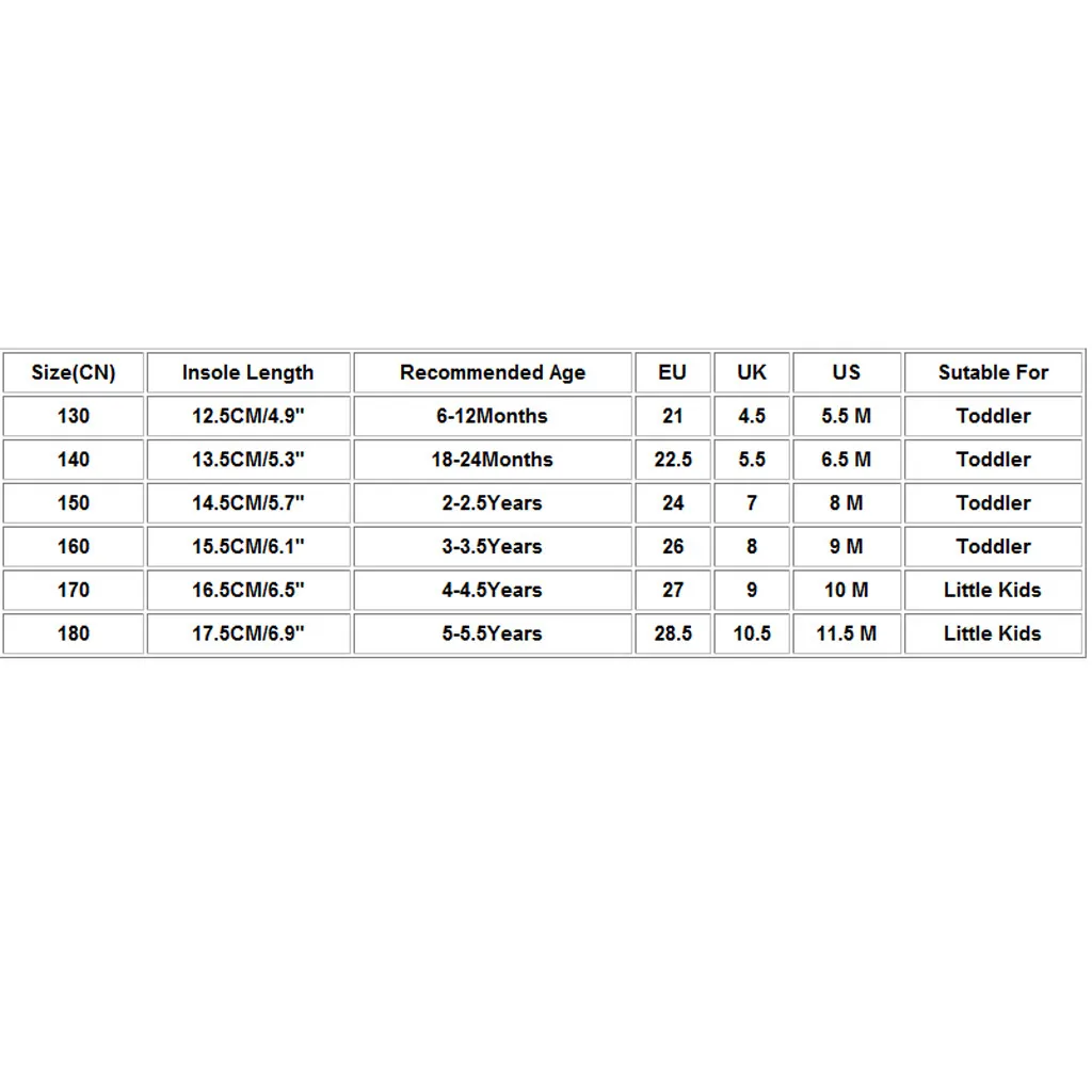 Размер (CN) Длина стельки Рекомендуемый возраст ЕС Великобритания США Sutable для 130 12,5 см/4,9 дюйма От 6 до 12 месяцев 21 4,5 5,5 м Для малышей 140 13,5 см/5,3 дюйма 18-24 месяцев 22,5 5,5 6,5 м Для малышей 150 14,5 см/5,7 дюйма 2-2-5 лет 24 7 8 м Для малышей 160 15,5 см/6,1 дюйма 3-3,5 года 26 8 9 м Для малышей 170 16,5 см/6,5 дюйма 4-4,5 года 27 9 10 м Маленькие дети 180 17,5 см/6,9 дюйма 5-5 лет 28,5 10,5 11,5 м Маленькие дети