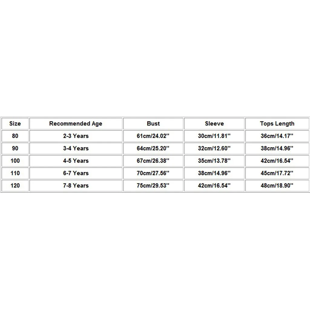 Размер Рекомендуемый возраст Бюст Рукав Длина топа 80 От 2 до 3 лет 61 см/24,02'' 30 см/11,81'' 36 см/14,17'' 90 От 3 до 4 лет 64 см/25,20'' 32 см/12,60'' 38 см/14,96'' 100 От 4 до 5 лет 67 см/26,38'' 35 см/13,78'' 42 см/16,54'' 110 От 6 до 7 лет 70 см/27,56'' 38 см/14,96'' 45 см/17,72'' 120 От 7 до 8 лет 75 см/29,53'' 42 см/16,54'' 48 см/18,90''Размер: 80 Рекомендуемый возраст: От 2 до 3 лет Обхват груди: 61 см/24,02 дюйма Рукав: 30 см/11,81 дюйма Длина топа: 36 см/14,17 дюйма Размер: 90 Рекомендуемый возраст: От 3 до 4 лет Обхват груди: 64 см/25,20 дюйма Рукав: 32 см/12,60 дюйма Длина топа: 38 см/14,96 дюйма Размер: 100 Рекомендуемый возраст: От 4 до 5 лет Обхват груди: 67 см/26,38 дюйма Рукав: 35 см/13,78 дюйма Длина топа: 42 см/16,54 дюйма Размер: 110 Рекомендуемый возраст: От 6 до 7 лет Обхват груди: 70 см/27,56 дюйма Рукав: 38 см/14,96 дюйма Длина топа: 45 см/17,72 дюйма Размер: 120 Рекомендуемый возраст: От 7 до 8 лет Обхват груди: 75 см/29,53 дюйма Рукав: 42 см/16,54 дюйма Длина топа: 48 см/18,90 дюйма