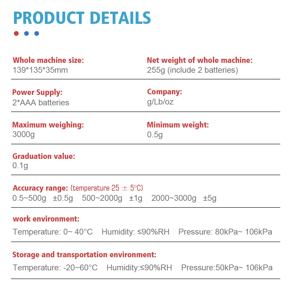 Цвет: черный и белый Единица измерения: g/Lb/oz Ёмкость: кг/3 кг/0,1 г принимает массу весом до 5 кг/0,1 Дисплей: ЖК-дисплей Питание: 2 * AAA батареи (не входят в комплект) Размер шкалы: 139*135*35 мм Размер коробки: 15x14,3x5 см Вес изделия: 255 г (включая 2 батареи)/320 г Размер упаковки: 52X47X32cm Рабочая среда: Температура: 0 ~ 40 ℃ влажность: ≤ 90% относительной влажности Давление: 80 кПа ~ 106 кПа Условия хранения и транспортировки: Температура:-20 ~ 60 ℃ влажность: ≤ 90% относительной влажности Давление: 50 кПа ~ 106 кПа