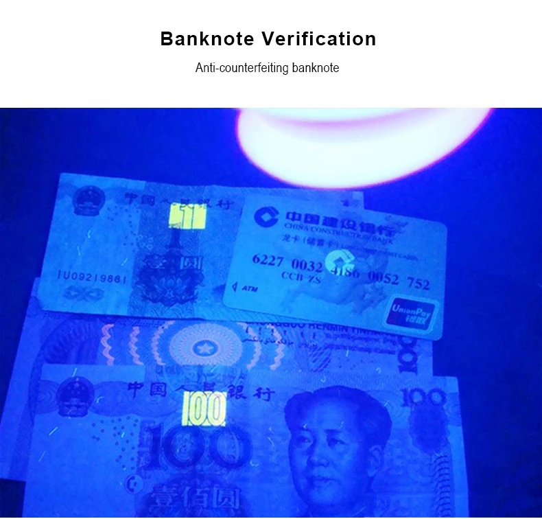3. Сотрудники правоохранительных органов могут использовать их для идентификации подлинности денег. Соединенные Штаты и многие другие страны использовали невидимую флуоресцентную полосу на своих больших номиналах, которые показаны только под черным светильник.