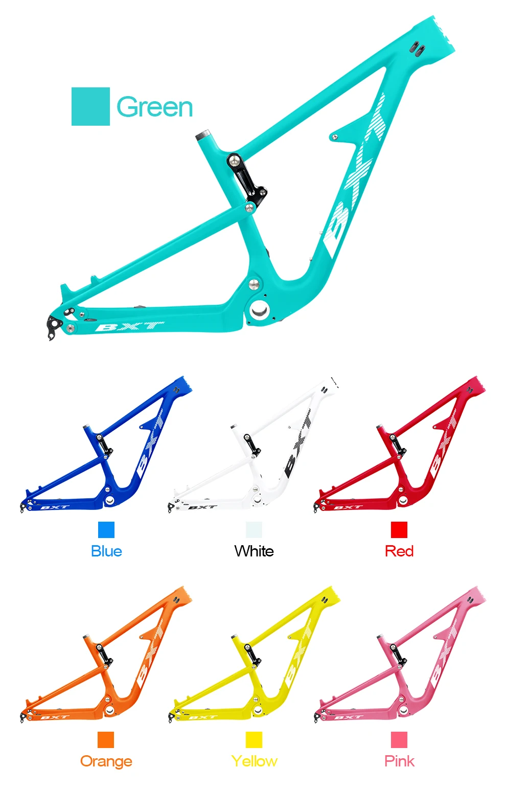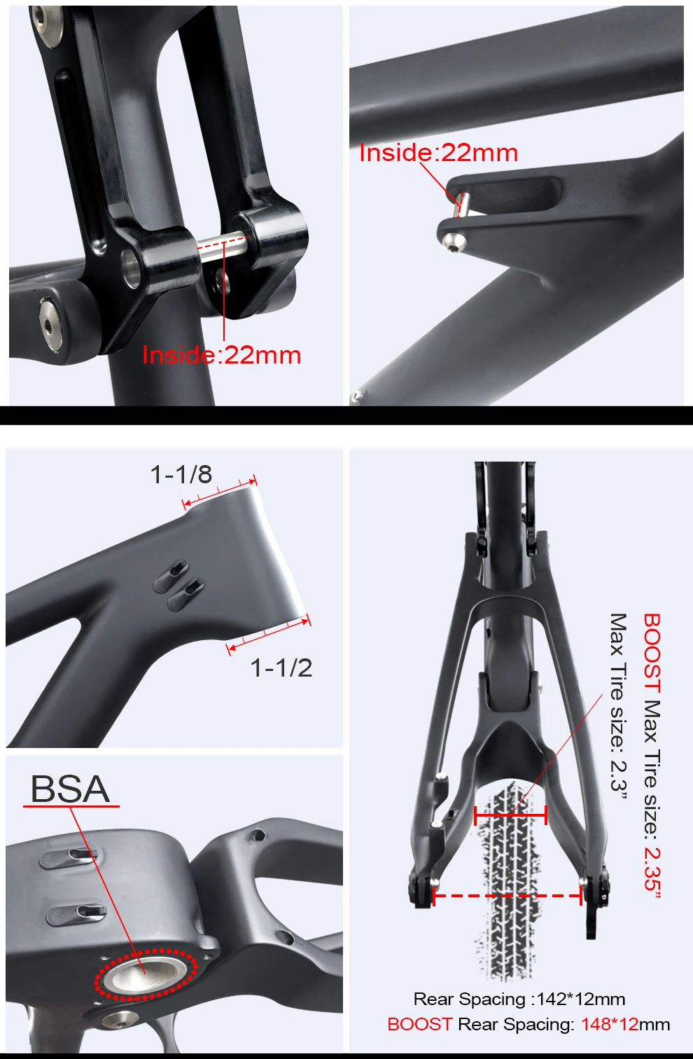 Материал: углеродное волокно T800 Модель: BXT-MTB-087 Ткань: UD Размер: S, M, L, XL Рама для путешествий: 140 мм Размер колеса: 29er * 2,3 Задний удар: 194*46 мм Тип тормоза: 160 мм, дисковый тормоз Вес: 2269 +/-50 г (для размера M) Нижний Кронштейн: BSA(73 мм) Задний дептор: 29er: 142*12 мм или 148*12 мм Трубка гарнитуры: 1 1/8 до 1 1/2, коническая Трубка сиденья: 31,6 мм Зажим: 34,9 мм Макс шин: 2,3 "(142*12 мм)/2,35"(148*12 мм)