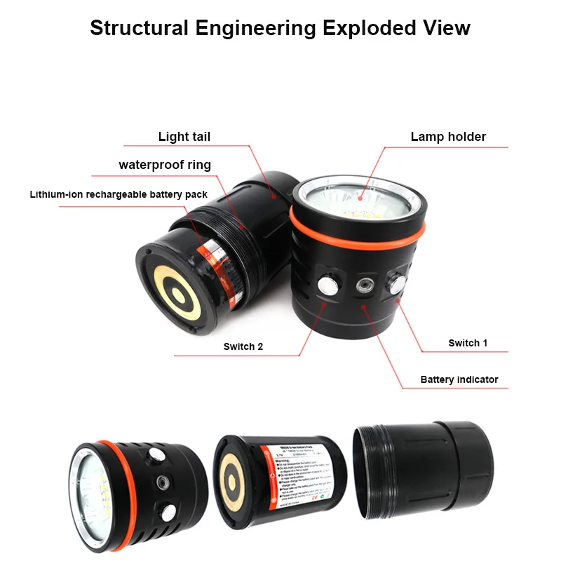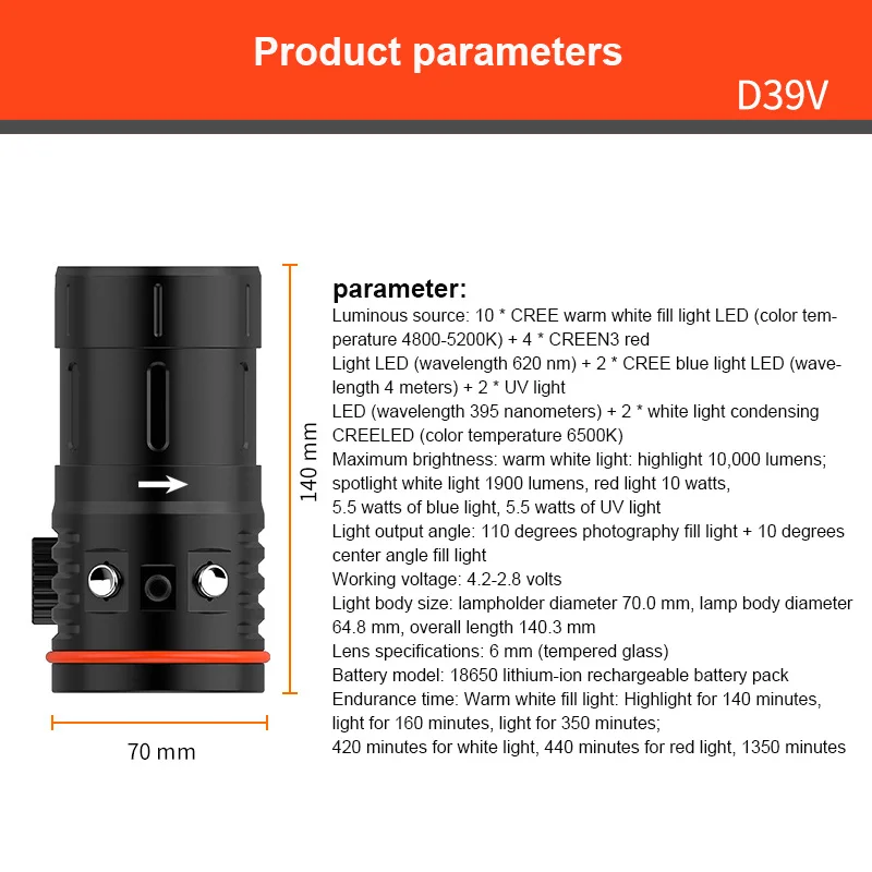 Модель: D39V Многофункциональный подводный фотографический светильник Лампа: 10 * CREE теплый белый заполняющий светильник светодиодный (Цветовая температура: 4800-5200K) 4 * CREE N3 красный светильник светодиодный (длина волны: 620 нм) 2 * CREE синий светильник светодиодный (длина волны: 455 нм) 2 * CREE фиолетовый светильник светодиодный (длина волны: 395нм) 2 * CREE белый Светодиодный прожектор (Цветовая температура: 6500K) Максимальная яркость: теплый белый (максимум 10000 люменов) Красный светильник (макс. 10 Вт) Синий светильник (макс. 5,5 Вт) Фиолетовый светильник (макс. 5,5 Вт) Белый прожектор (макс. 1900 люменов) Время работы: теплый белый заполняющий светильник: высокий 140 мин, средний 160 мин, низкий 350 мин Белый прожектор: 420 мин Красный светильник: 440 мин Синий светильник: 1350 мин Фиолетовый светильник: 1350 мин Угол светильник луча: 110 ° обращаем ваше внимание, заполнить светильник + 10 ° центр угол заполнения светильник Управление напряжение: 4,2 V до 2,8 V Размер корпуса лампы: 70,0 мм (диаметр головки лампы) * 64,8 мм (диаметр корпуса лампы) * 140,3 мм (длина) Характеристики линз: 6 мм (закаленное стекло) Тип батареи: литий-ионный аккумулятор 18650 Вес в воздухе: около 524. (w/o батарея); 857 г. (w/батарея) Вес под водой: около 425 г (Вт/аккумулятор) Водонепроницаемость: 100 м под водой Материал корпуса: прочный авиационный алюминий Обработка поверхности: Жесткий анодированный премиум-Тип III Цвет: черный Защита от перегрузки батареи, защита от полярности