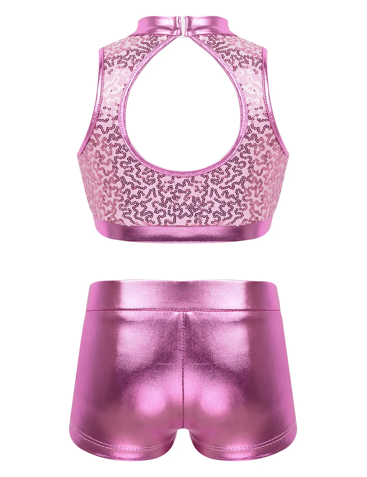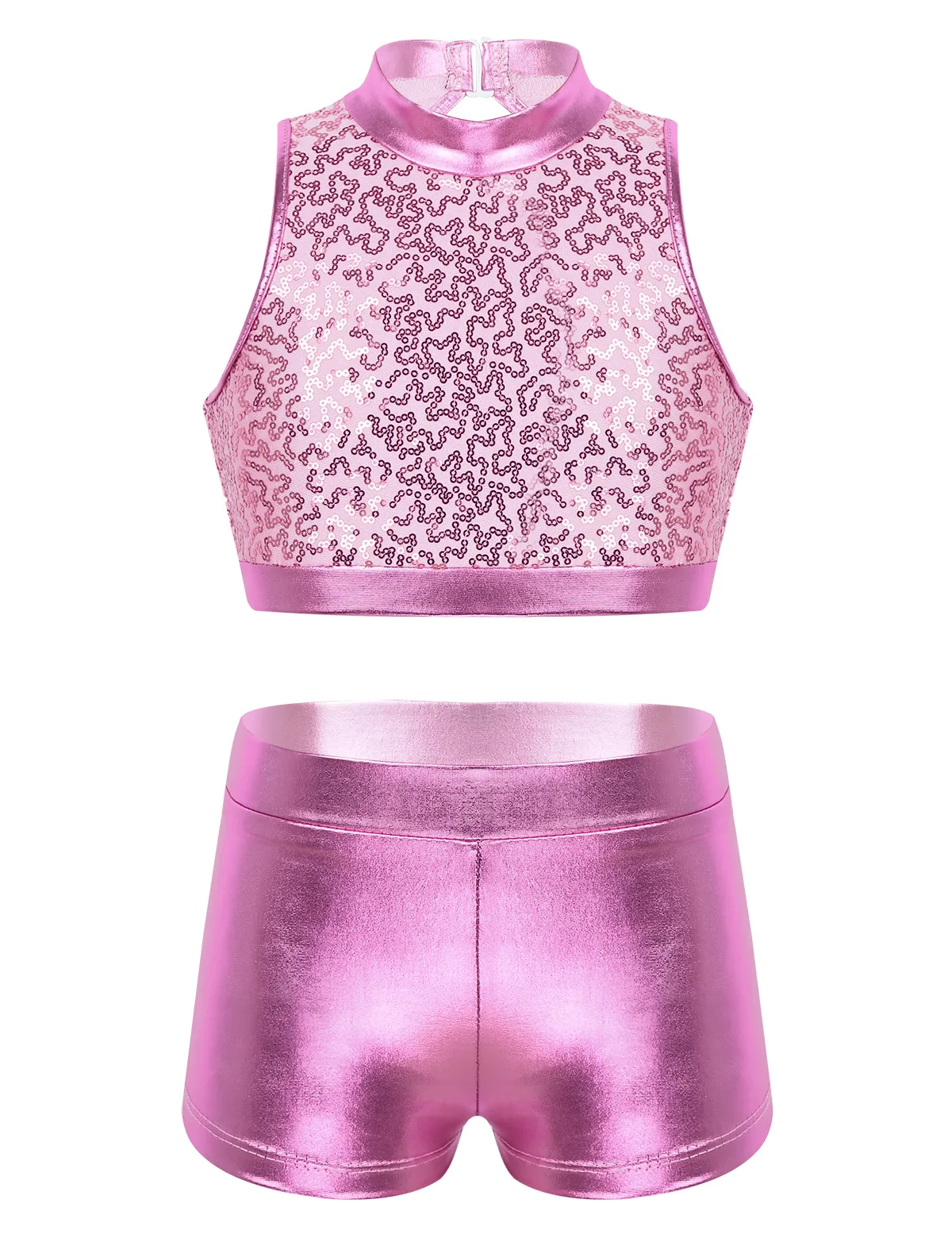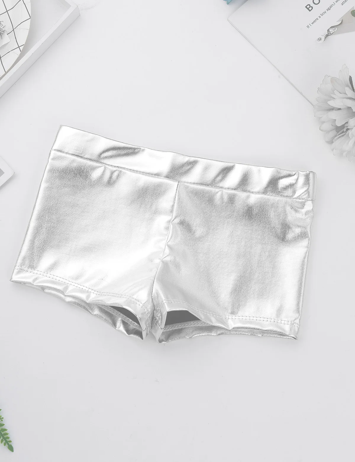 Подходящие шорты со средней посадкой цвета металлик с широким эластичным поясом. Стильная и блестящая танцевальная одежда для вашей девочки.