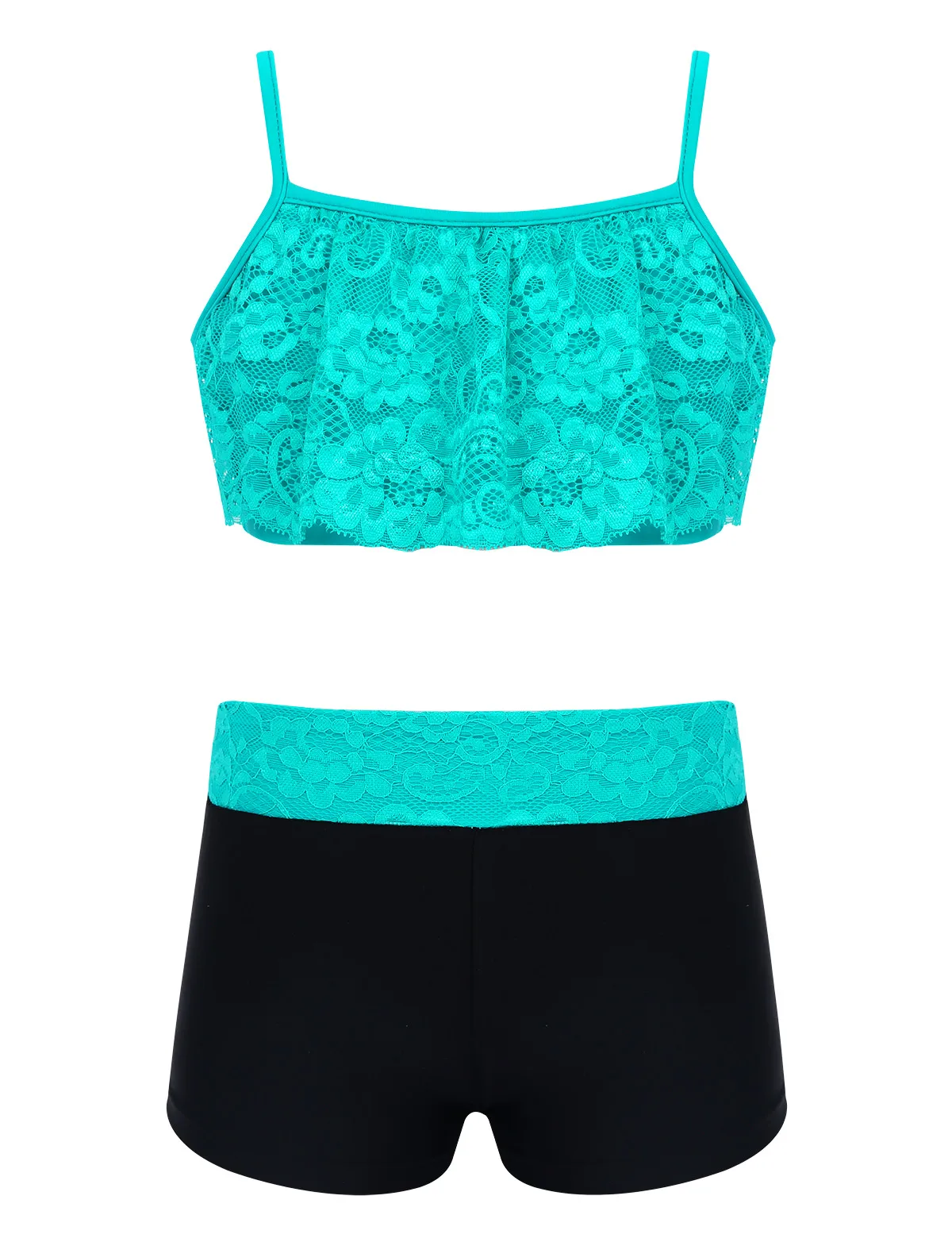 Укороченный топ на бретельках-спагетти, кружевной топ с оборками спереди. Надежная застежка.