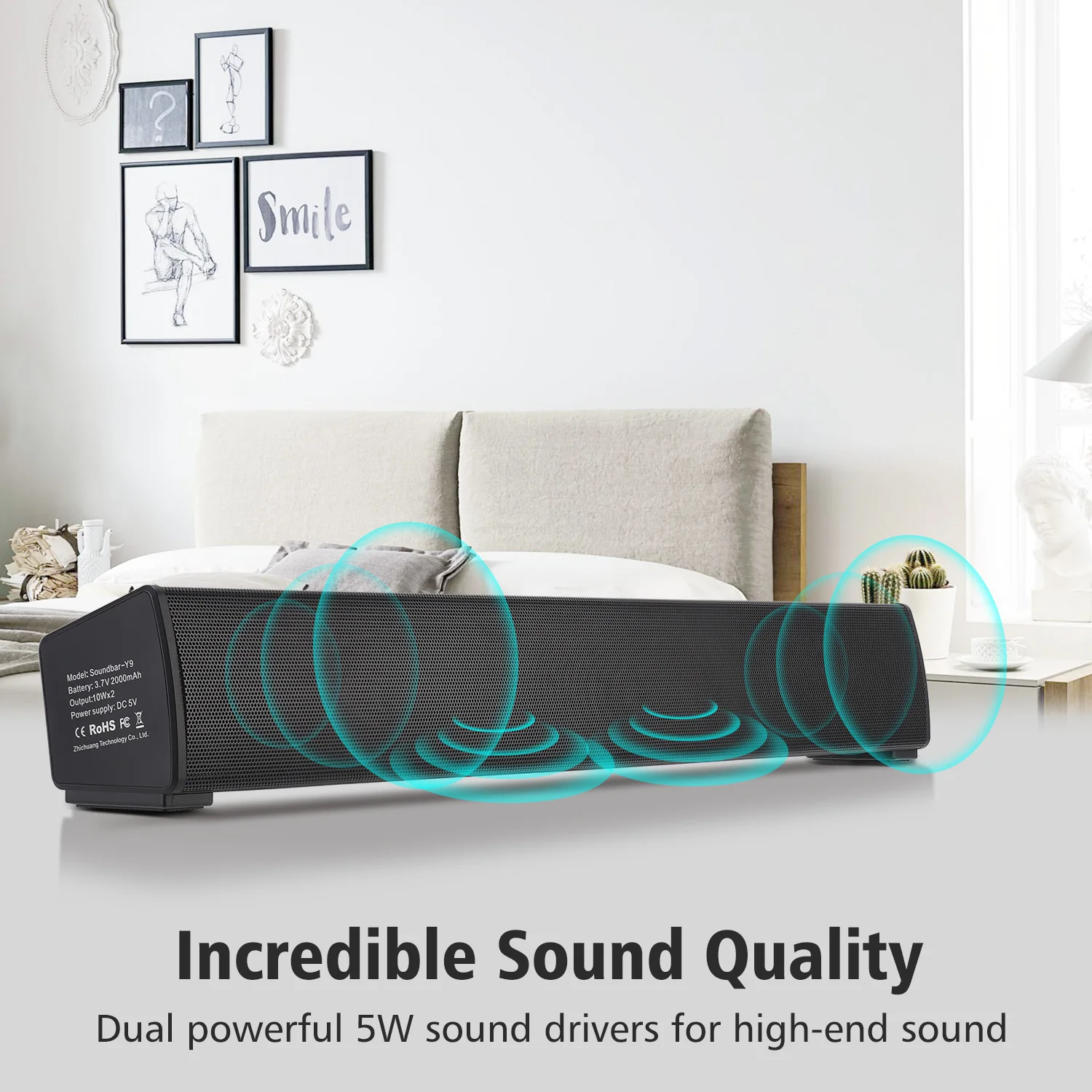 Встроенная перезаряжаемая батарея емкостью 2000 мАч, до 8 часов воспроизведения. Если вы смотрите футбольный матч, победив свою игру враг или расслабляясь с любимой музыкой, он может работать очень хорошо. Для экономии энергии Саундбар автоматически переходит в режим ожидания, когда он не работает в течение пяти минут.
