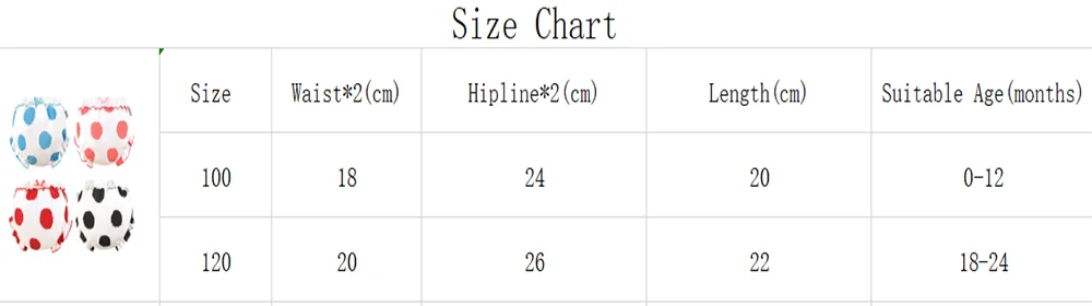 Размер 100, обхват талии 18*2 см, обхват бедер 24*2 см, длина 20 см, подходит для малышей 0-12 месяцев Размер 120, обхват талии 20*2 см, обхват бедер 26*2 см, длина 22 см, подходит для детей 12-24 месяцев