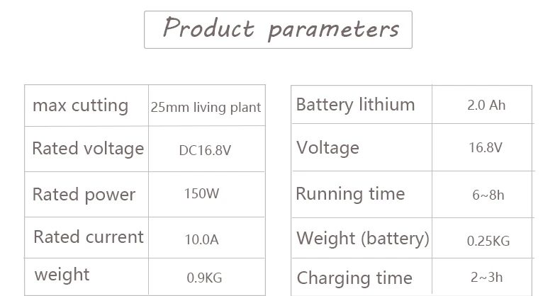 Беспроводные секатора ножница 1 Максимальная резка 25 мм живое растение 2 Номинальное напряжение постоянного тока 16,8 в 3 Номинальная мощность 150 Вт 4 Номинальный ток 10.0A 5 Защита от тока ≥ 35A 7 Вес 0,9 кг Батарея литиевая батарея 1 Ёмкость 2.0Ah 2 Напряжение 16,8 V 3 Время работы 6-8 ч 4 Вес 0,25 кг Зарядное устройство 1 Номинальное напряжение 100-240 В переменного тока, 50-60 Гц 2 Выход напряжение DC16.8V 3 зарядный ток никель-металл-1.0A 5 время зарядки 2-3 ч