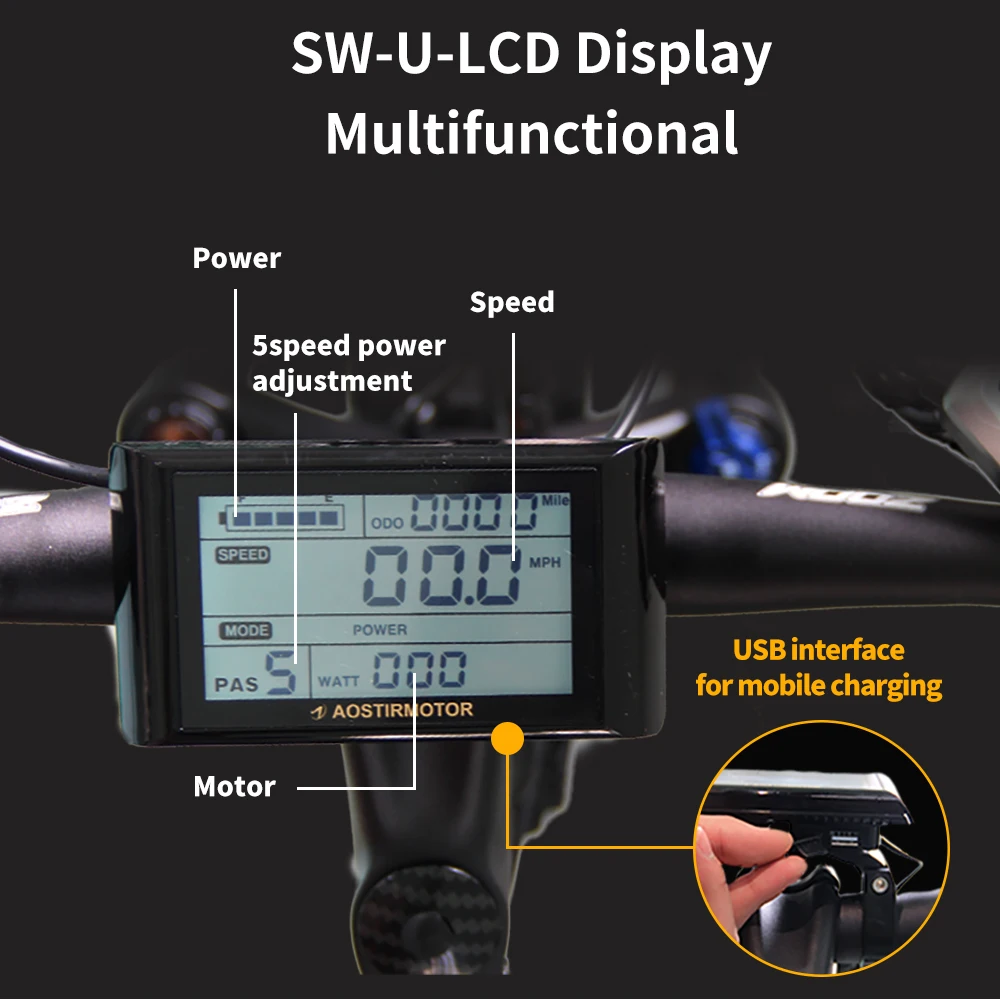 Самостоятельная доставка, Скидка 100 долл. США! Адрес склада: Онтарио, CA, США Двигатель: 750 Вт бесщеточный мотор-редуктор. В режиме полной зарядки и чистой мощности расстояние езды составляет 25-35 км Размер батареи: 48V 10.4Ah литиевая батарея • Питание: Интеллектуальный контроллер 48 В 22A Шины: 26x4,0 дюймов Толстая шина. Может адаптироваться к снегу, песку и другим комплексным рельефам. Зарядное устройство: 110-220 В (на полную зарядку аккумулятора требуется 4-6 часов, чтобы продлить срок службы аккумулятора, регулярно заряжайте его) SW-U-LCD: Вы можете установить диаметр колеса, скорость, подсветку, блок пробега, режим езды, PAS передач и зарядить ваш телефон. СВЕТОДИОДНЫЙ экран отображает мощность батареи, скорость, пройденное расстояние, шестерню, мощность. Режим езды на велосипеде: Три режима езды: Педальный режим/режим наддува/режим питания (электрические велосипеды из Германии склад не имеют режима питания) Максимальная скорость: В полностью заряженном состоянии, максимальная скорость может достигать 27.9mp/ч