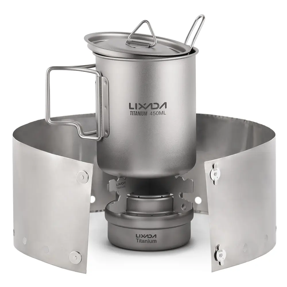 5 шт. набор посуды для кемпинга включает в себя кастрюлю 750 мл, спиртовую плиту, стойку для печи, СКЛАДНУЮ спортивную площадку и ветровое стекло.