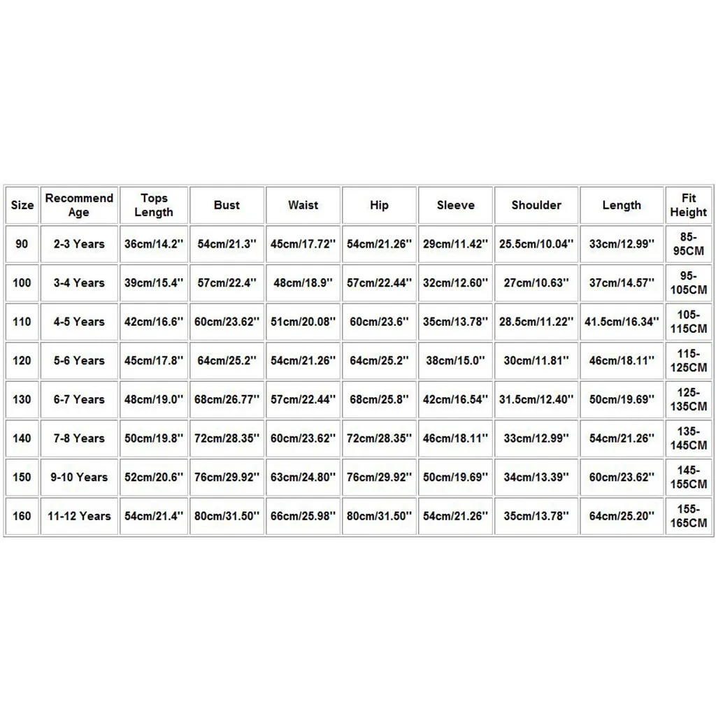 Размер Рекомендуемый возраст Длина топа Бюст Талия Бедра Рукав Плечо Длина Подходящая высота 90 От 2 до 3 лет 36 см/14,2'' 54 см/21,3'' 45 см/17,72'' 54 см/21,26'' 29 см/11,42'' 25,5 см/10,04'' 33 см/12,99 дюйма 85-95 см 100 От 3 до 4 лет 39 см/15,4 дюйма 57 см/22,4'' 48 см/18,9'' 57 см/22,44'' 32 см/12,60'' 27 см/10,63'' 37 см/14,57'' 95-105 см 110 От 4 до 5 лет 42 см/16,6'' 60 см/23,62'' 51 см/20,08'' 60 см/23,6'' 35 см/13,78'' 28,5 см/11,22'' 41,5 см/16,34'' 105-115 см 120 От 5 до 6 лет 45 см/17,8'' 64 см/25,2'' 54 см/21,26'' 64 см/25,2'' 38 см/15,0'' 30 см/11,81'' 46 см/18,11'' 115-125 см 130 От 6 до 7 лет 48 см/19,0'' 68 см/26,77'' 57 см/22,44'' 68 см/25,8'' 42 см/16,54'' 31,5 см/12,40'' 50 см/19,69'' 125-135 см 140 От 7 до 8 лет 50 см/19,8'' 72 см/28,35'' 60 см/23,62'' 72 см/28,35'' 46 см/18,11'' 33 см/12,99 дюйма 54 см/21,26'' 135-145 см 150 От 9 до 10 лет 52 см/20,6'' 76 см/29,92'' 63 см/24,80'' 76 см/29,92'' 50 см/19,69'' 34 см/13,39'' 60 см/23,62'' 145-155 см 160 11-12 лет 54 см/21,4'' 80 см/31,50'' 66 см/25,98'' 80 см/31,50'' 54 см/21,26'' 35 см/13,78'' 64 см/25,20'' 155-165 см