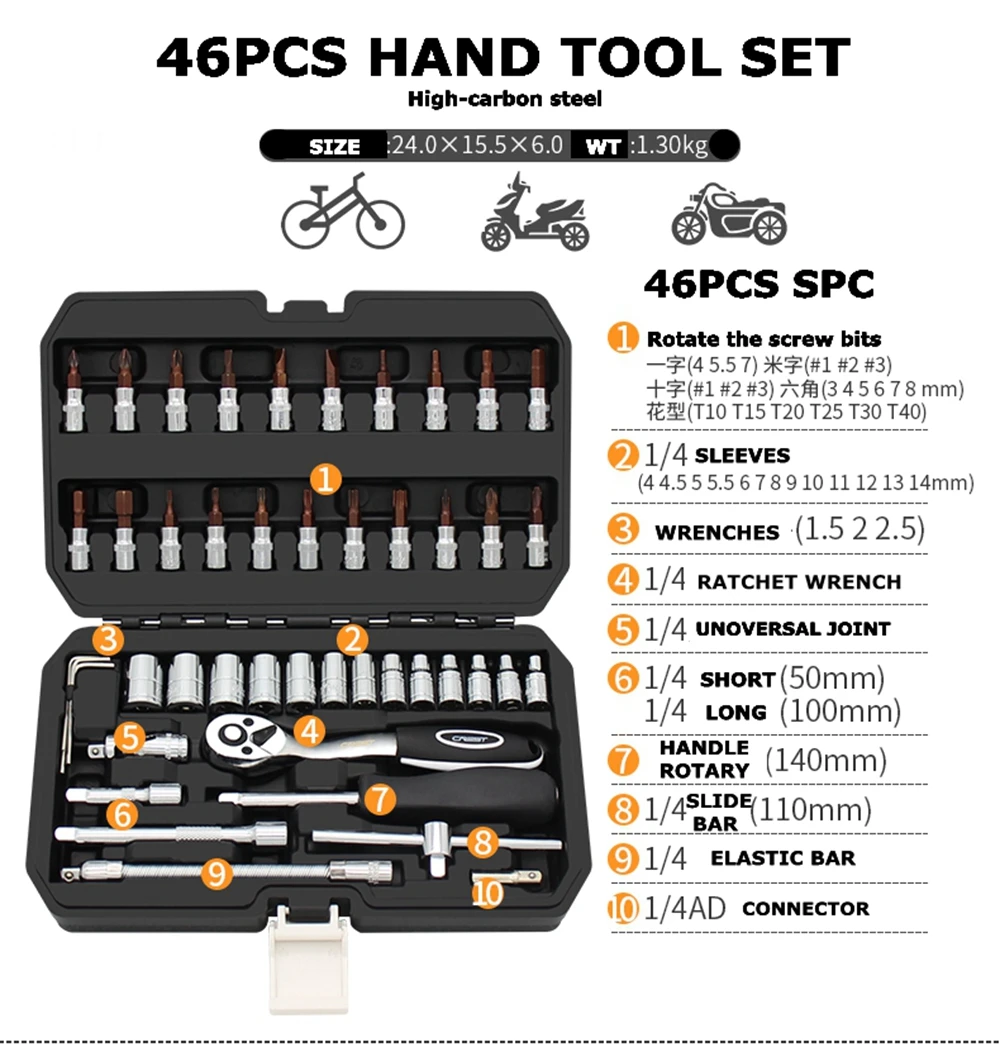 21 * гнезда под зубки: SL4, 5,5, 7,PH1,2,3 PZ1,2,3 HEX3, 4,5, 6,7,8 мм T10,T15,T20,T25,T30,T40 13*1/4 розетки: 4,4.5,5, 5,5, 6,7,8,9,10,11,12,13,14 мм 3 * шестигранный ключ 1*1/4 универсальный шарнир 1 * короткая удлинитель 1 * Длинная удлинитель 1*1/4 трещотка, гаечный ключ 1 * шарнирное соединение 1*1/4 эластичный удлинитель 1*1/4 раздвижная удочка (110 мм) 1*1/4 AD Электрический адаптер 1 * коробка Pacakge