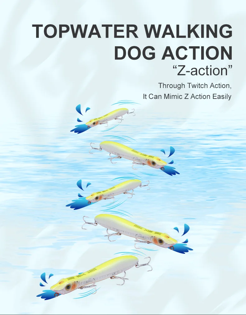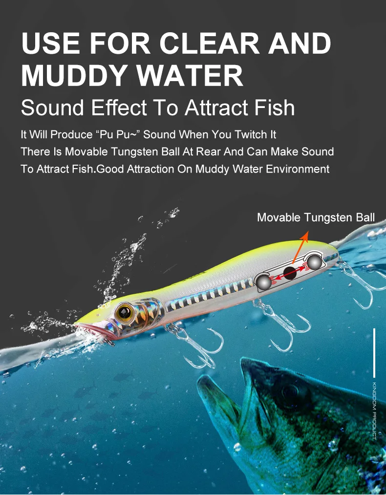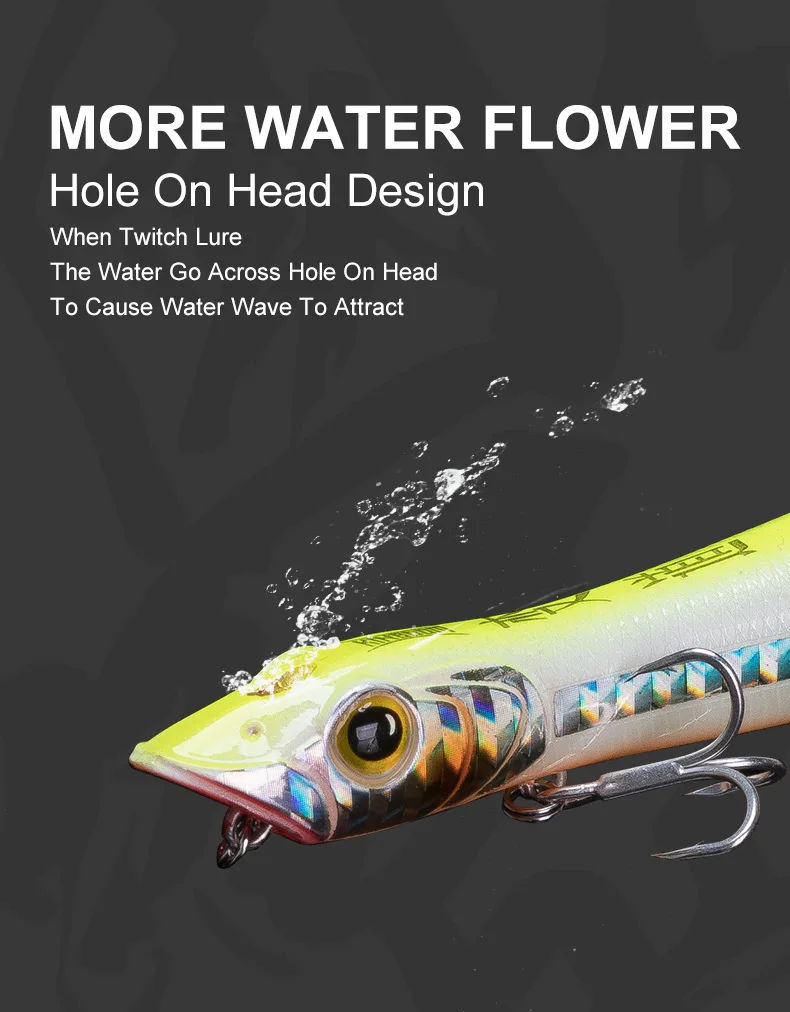 1. Крючки: высокое качество кровяного слота тройной крючок обладает более сильным проникновением 2. Имитация рыбьей кожи: специальная Лазерная линия для привлечения большего количества рыб, УФ-покрытие, чтобы избежать царапин 3. Вольфрамовые шарики: вольфрамовые шарики внутри, чтобы сохранить баланс рыболовной приманки, для дальней дистанции литья. Звуковые волны производятся в дерганье 4. Более прочные велосипедные кольца: усиливают двойной круг повышенное сопротивление тяге. 5. Примите с двойной формой плавания, когда она попадет в воду, прерывистый, это будет Поппер приманка. Если дергать с равномерной скоростью, он плавает как приманка для карандашей. Есть отверстие на верхней части головы, звук пузырьков, выходящих в подергивании, притягивает больше рыб.