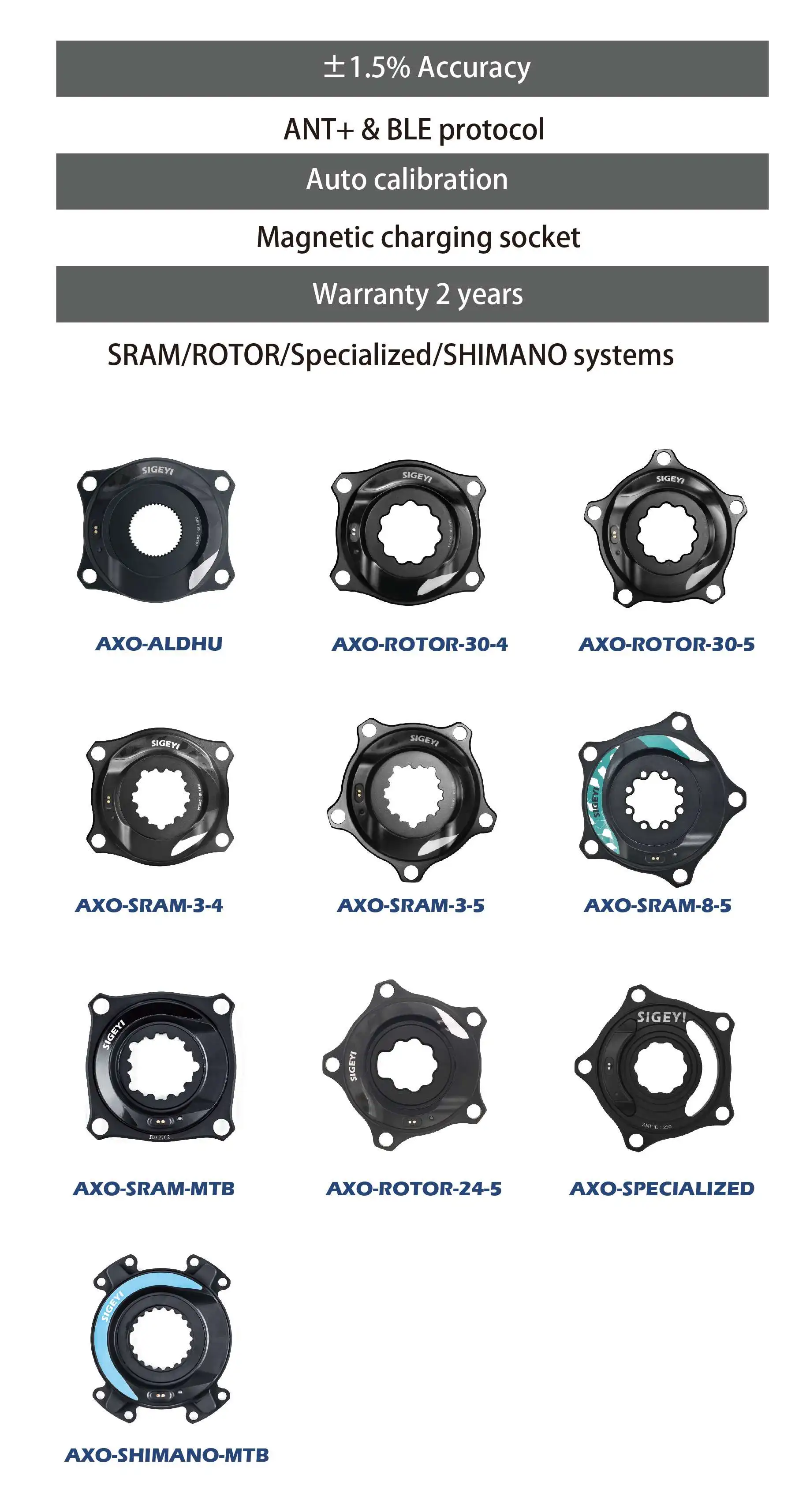 АХО паук Мощность метр SRM: измеритель мощности паук Автоматическая ноль/автоматическая калибровка Точная и стабильная ± 1.5% точность точное Кварк: измерение обеих ног Стабильная и автообнуления Quarq: автоматическая калибровка во время езды. Нет необходимости поворачивать педаль или вручную калибровать через головное устройство Двойной передачи данных ANT + BLE Quarq: технология Bluetooth с низким энергопотреблением и беспроводная передача данных ANT +. Магнитный перезаряжаемый литиевая батарея Quarq: изменить без инструментов В режиме реального времени компенсация температуры 120 ч долгое время работы 3 ключевые данные: мощность, Каденс, Баланс Силы влево/вправо Широкий спектр совместимости: SRAM (дорога и горы), ротор, специализированные... Совместимость со многими кольцами: оригинальные кольца для колец, кольца для цепей shimano, овальные кольца для цепей Кварк: замена цепных колец, не влияя на точность. Кварq: не требуется магнит каденса Множественная техническая поддержка, ± 1.5% точность не только слов Авто ноль без ручного управления, больше не делать нулевой сброс вручную Компенсация температуры в реальном времени: хотя температура неожиданно меняется, она все еще является точной Передача данных в ANT + и BLE одновременно, Совместимость с различными головными блоками ANT +: велосипедный компьютер, велосипедные часы, компьютер (Garmin, Bryton, Igpsport, ...) BLE: смартфон, pad (Zwift , Strava , SIGEYI app)