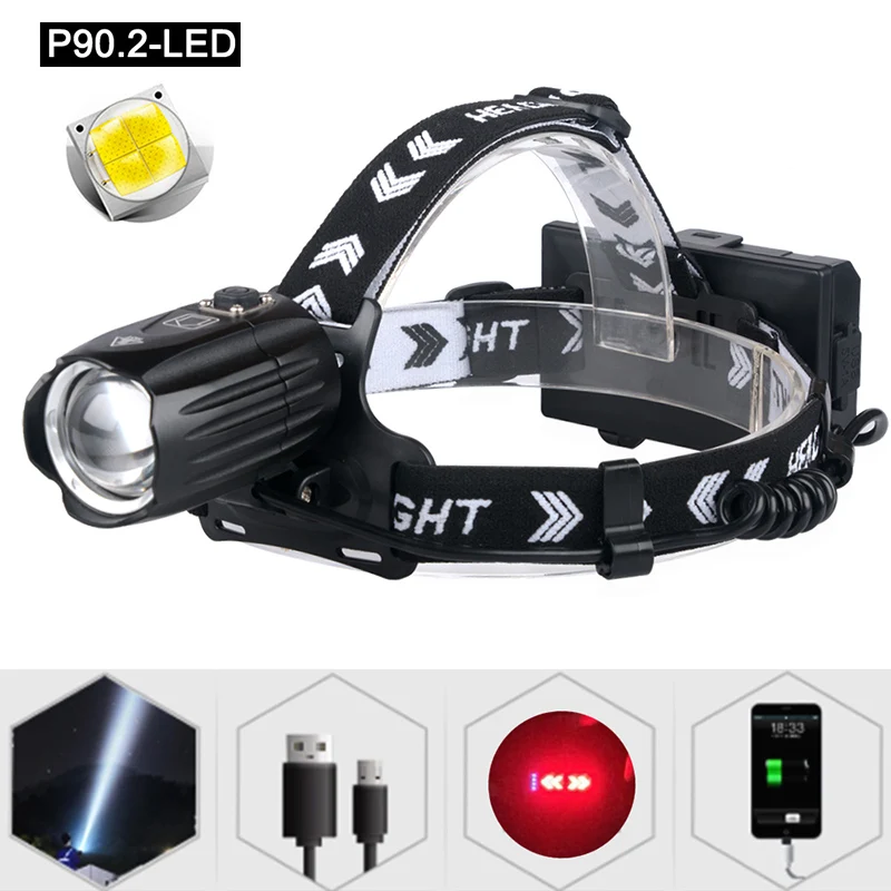 1. Ультра-яркие лампы XHP90.2, эквивалентные яркости 4 светодиодных шариков T6. Расстояние освещения может достигать около 500 метров, так что вы можете увидеть все в уличной ночи. 2. Обрабатывающий центр обработки, сегментированный ток, легкое рассеивание тепла. 3. Большая диафрагма объектива для более широкого диапазона освещения светильник. 4. Водонепроницаемый материал для всех огней, поэтому вы можете использовать его в дождливые дни. 5. Поддерживает выход батареи, вы можете зарядить свой телефон. Функция ввода и вывода батарейного отсека, может использоваться как мобильный Банк питания, отсек для батарей с дисплеем питания, 4 Светодиодный индикатор, каждый светодиодный индикатор-25% мощности. 6. Ремень для фар имеет нескользящий ремень, который удобен и не скользит.