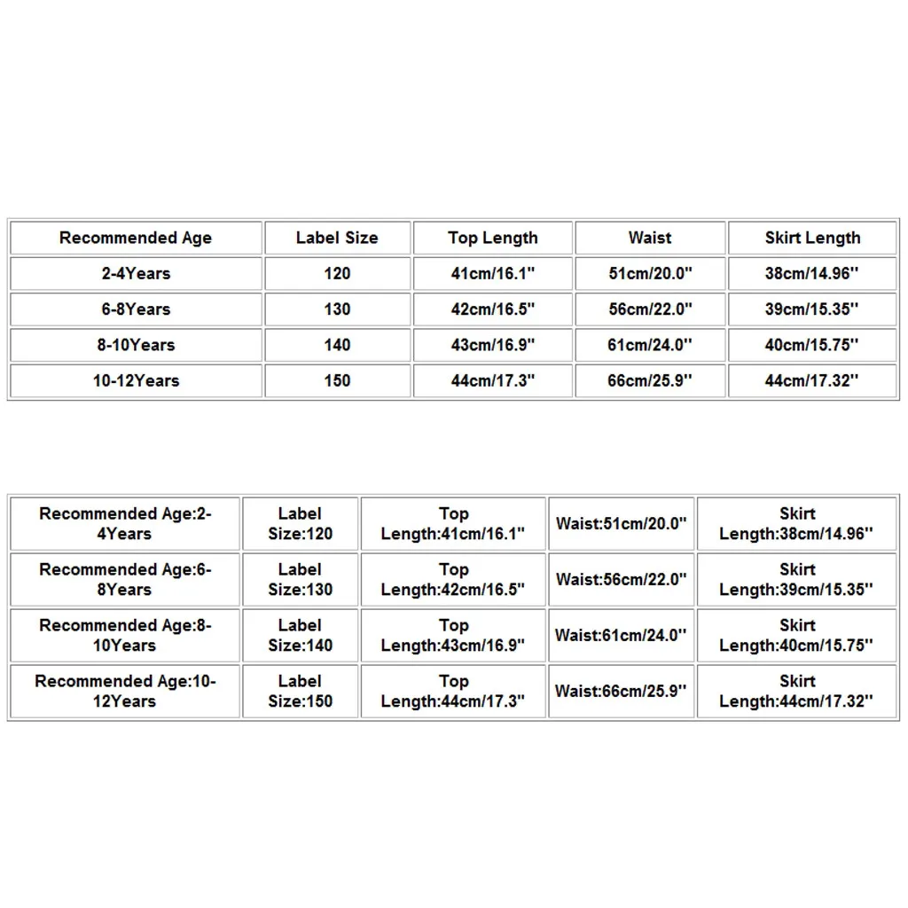 Рекомендуемый возраст Этикетка Размеры Топ Длина Обхват талии Юбка Длина 2-4Years 120 41 см/16,1" 51 см/20,0" 38 см/14,96'' 6-8Years 130 42 см/16,5" 56 см/22,0" 39 см/15,35'' 8-10Years 140 43 см для ухода за ребенком для мам/16,9" 61 см/24,0'' 40 см/15,75'' 10-12Years 150 44 см/17,3" 66 см/25,9'' 44 см/17,32''