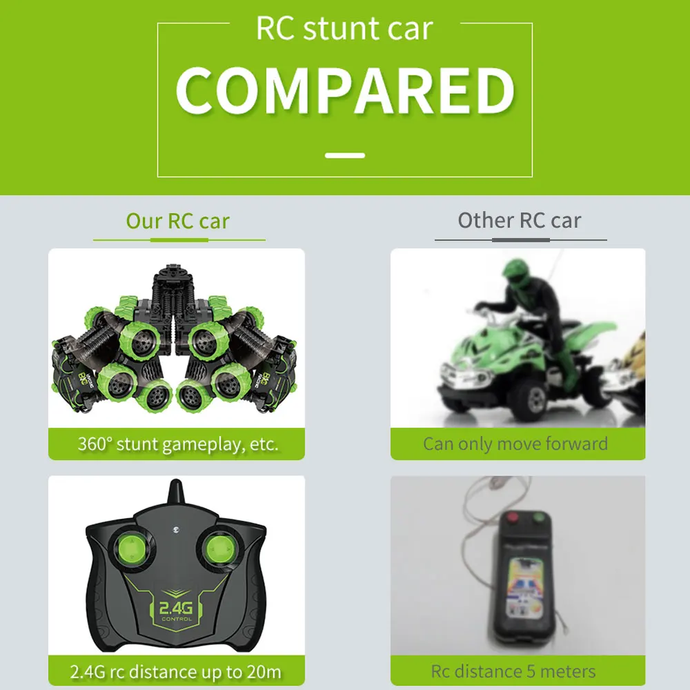 Features: FULL FUNCTIONS STUNT CAR: Go forward, backward. Standing at 90 degrees, 360 degrees high speed rotation, telescopic deformation when driving. Giving you an interesting experience. RC CAR SAFETY CERTIFICATIONS: This rotating drift stunt toy car is manufactured with a number of safety certifications, and is made of environmentally safe materials, so you can use it without worry. 2.4GHz WIRELESS TECHNOLOGY: With a control range of 20 meters and stronger anti-jamming technology than ordinary remote control mini motorcycles. BALANCE AND GRIP: The widened tires give the stunt car a superior balance, making it easy for anyone to control the toy car. The rubber outer tires give the car better grip and enhanced shock absorption. NOTE: Any problem, please contact us without hesitation. Honor to serve you! Specification: Item name: RC Stunt Car Main material: Plastic Color: Orange and green Speed: 12km/h Frequency: 2.4G Control distance: About 20m Car battery: 3.7V 500mAh battery Battery of remote controller: 2* 1.5 AA battery (not included) Charging time: About 90 minutes Working time: 12-15 minutes Item size: 15*12.7*11.5cm; Extended: 28*11.5*8.3cm Item weight: 340g (including battery) Age: ≥5 Note: * There could be some deviations due to manual measurement or slight color difference owing to photographing condition. Thank you for your understanding. * Don't over-charge, or over-discharge batteries. Don't put it beside the high temperature condition. Don't throw it into fire. Don't throw it into water. Package information: Package size: 19.5*13*12cm Package weight: 519g Gift box package Package List: 1* RC Stunt Car 1* Remote Controller 1* Car Battery(random color) 1* USB Charger