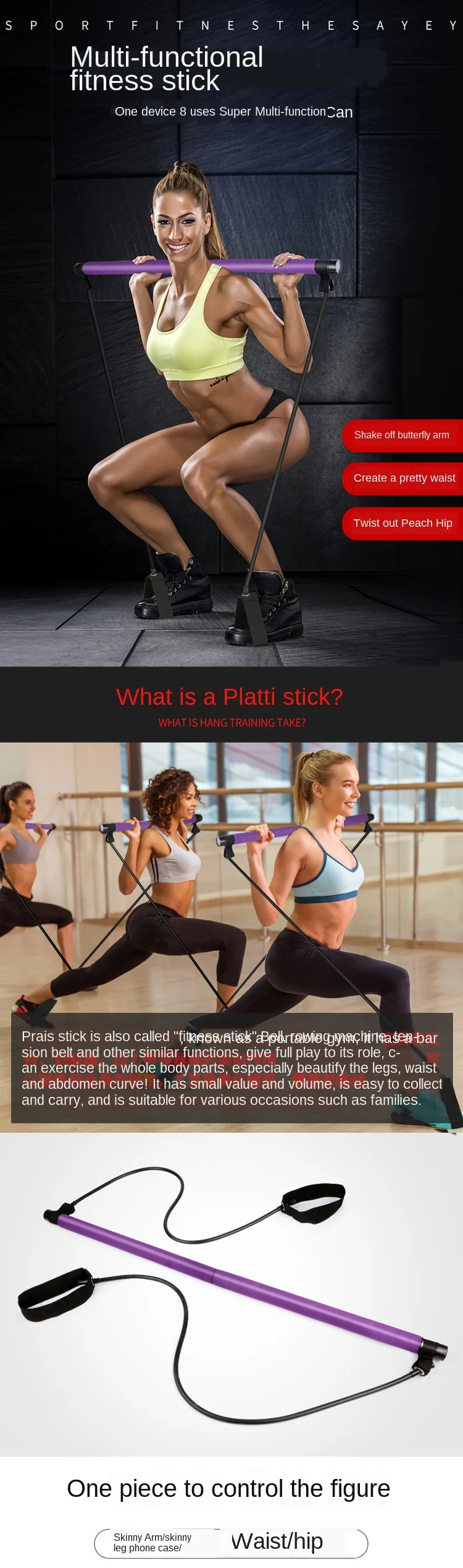 Характеристики: 1. Внутренняя часть выполнена из стали, высокой прочности и долговечности. 2. Прочная и износостойкая Нескользящая ручка, с использованием прочной и удобной пены для увеличения долговечной эластичности и поглощения ударов, подходит для ваших рук. 3. Средняя конструкция может быть быстро подключена и отключена для удобной переноски. 4. Многофункциональность: очень подходит для упражнений на растяжку, упражнений на растяжение, сопротивления, низкого воздействия и предотвращения травм. Технические характеристики: Материал: термопластичный каучук + Эва Цвет: фиолетовый, розовый