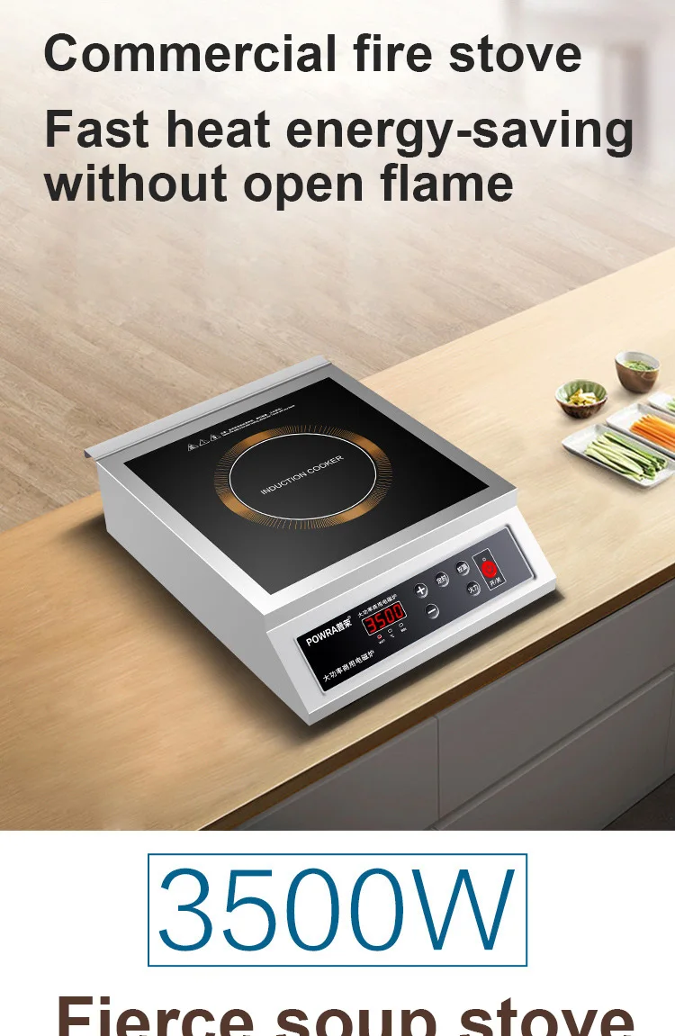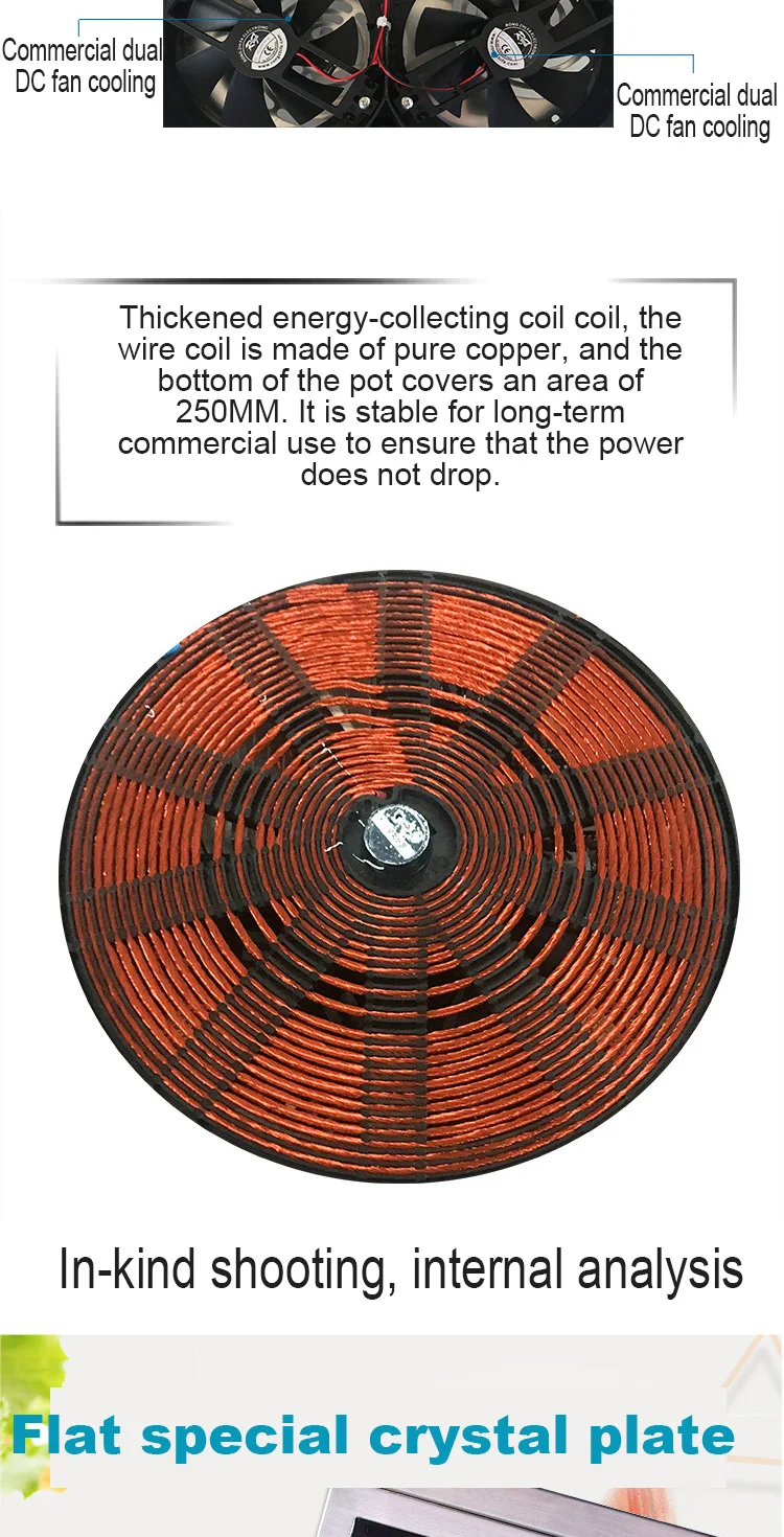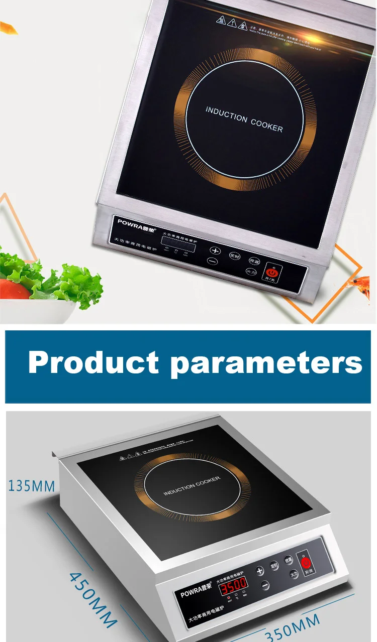 Параметры продукта 3000W plane Коммерческая индукционная плита: 1. Длина, ширина, высота (измерение размера): 450 мм * 360 мм * 125 мм 2. Описание максимальной нагрузки: 60 кг 3. Диаметр нагревательной пластины: 240 мм, количество проводов: 45, магнитная полоса: 10 бар 4. Параметры продукта: 13 уровней огневой мощи, 13 уровней регулировки температуры. 5. Время: 24 часа, диапазон температур: от 60 до 280 градусов, диапазон огневой мощи: 400 Вт-3000 Вт" 6. Является ли черная кристальная панель водонепроницаемой: IPX4 класс 4 водонепроницаемый. 7. Черный кристалл Размер платы: 300 мм * 300 мм 8. Количество вентиляторов охлаждения: 2400 об/мин, напряжение 18 в, диаметр 116 мм 9. Материал корпуса: нержавеющая сталь