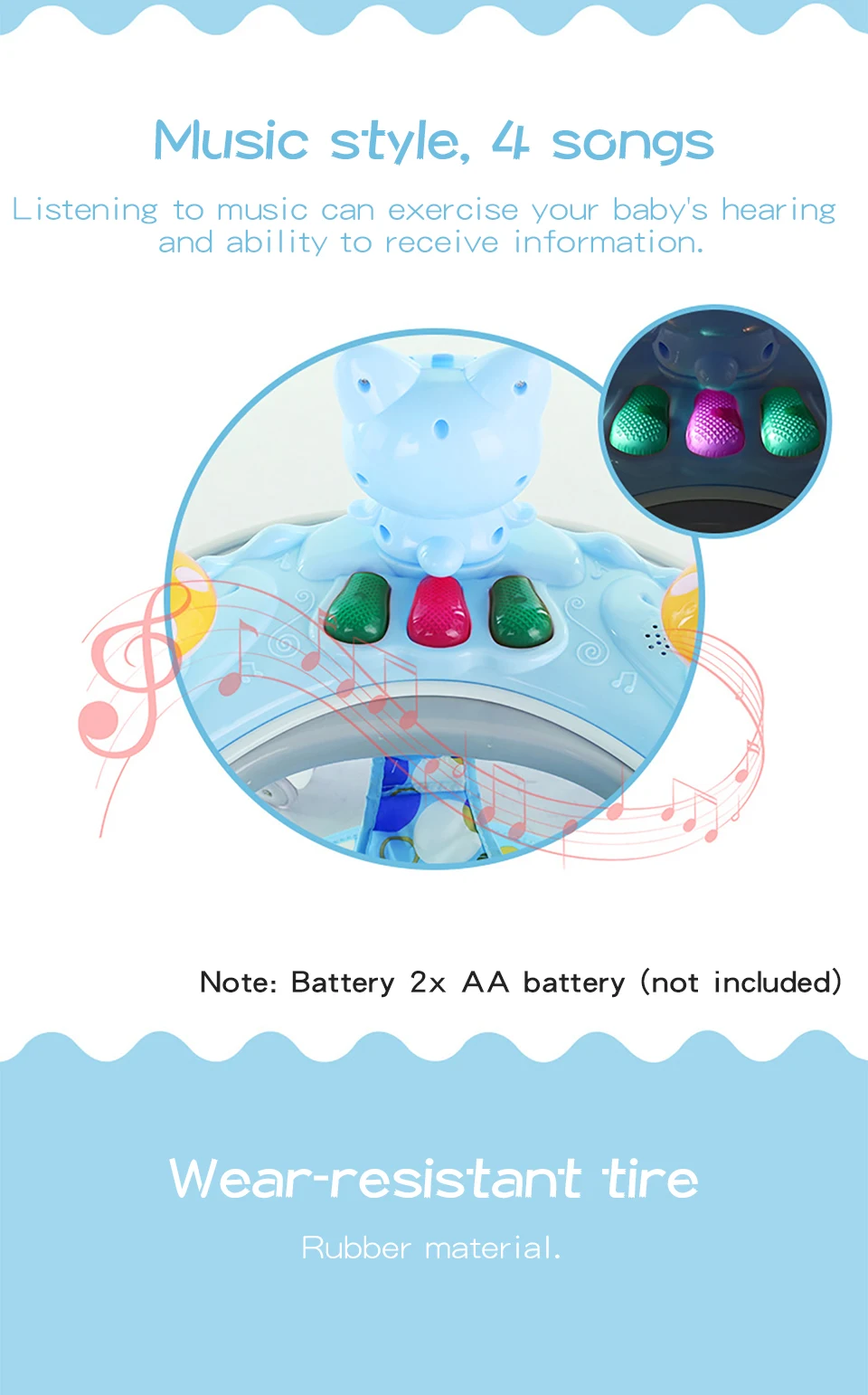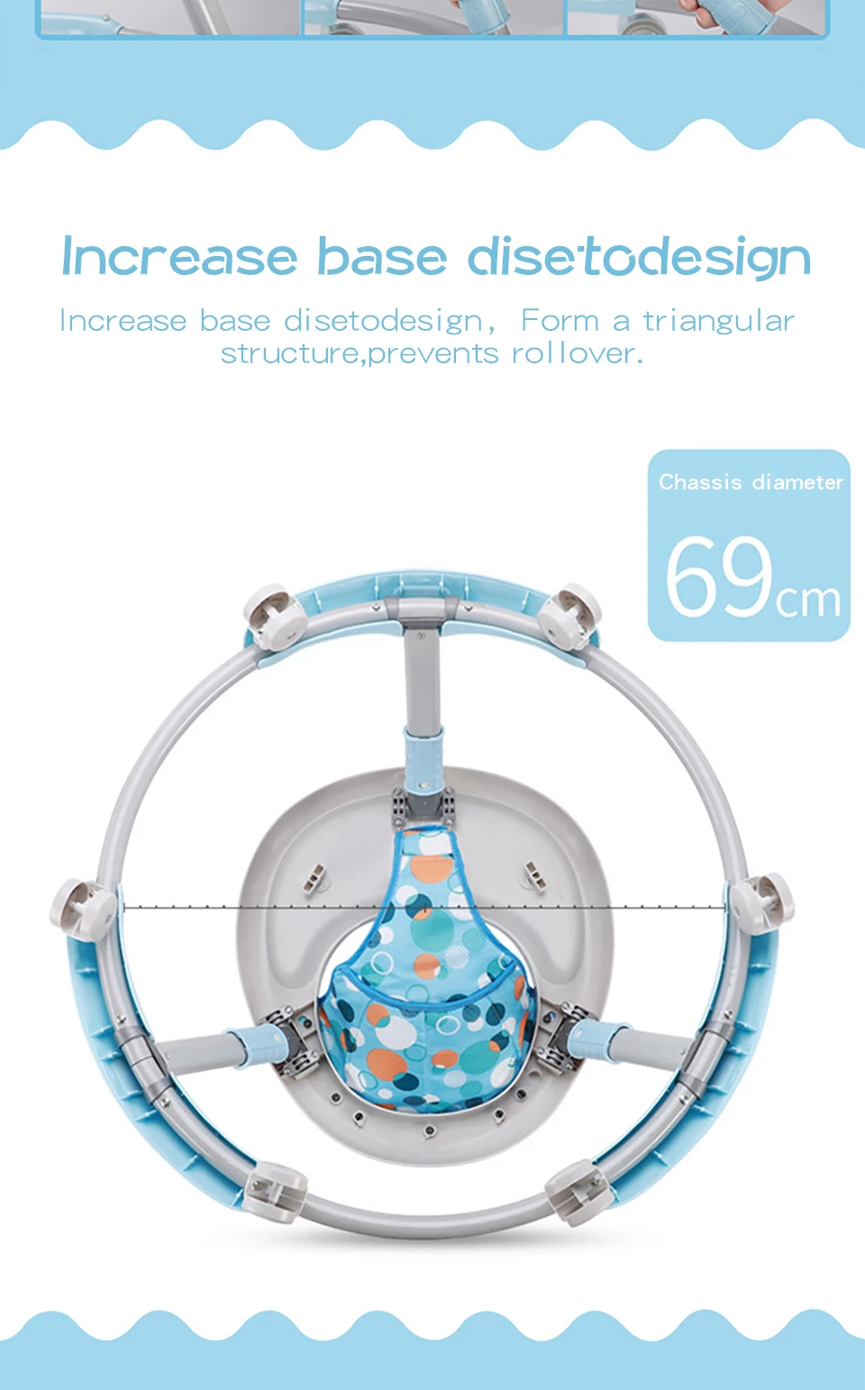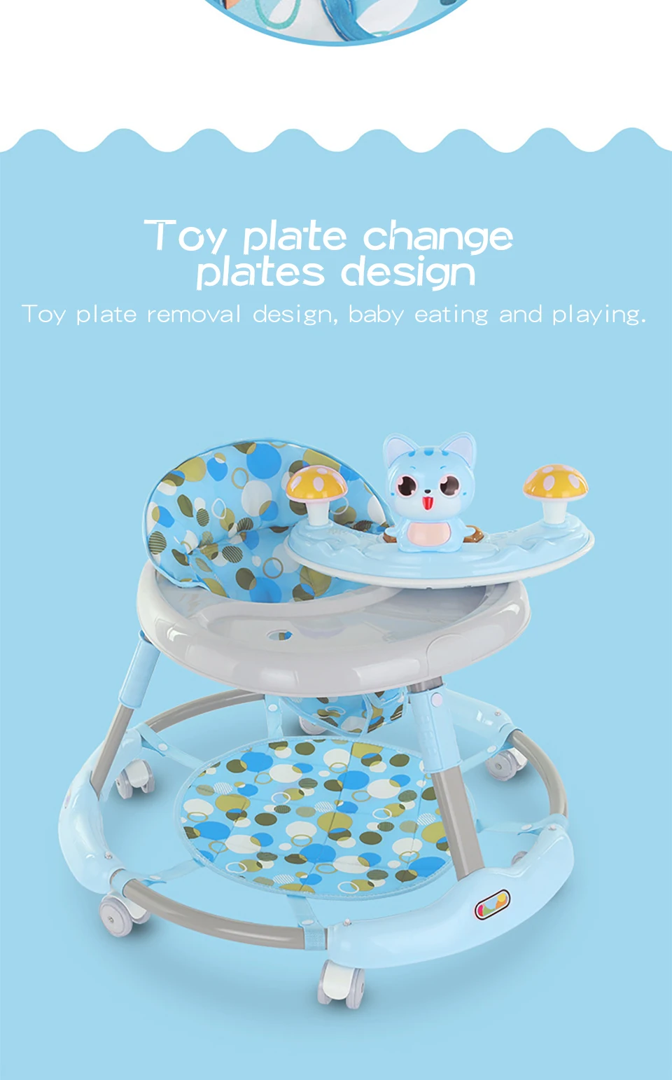 Название продукта: ходунки для малышей Размер изделия: 40 см * 69 см (16*27 дюймов) Описание товара: 1. Подходит для 6-24 месяцев 2. С толстой алюминиевой трубкой, несущая способность сильна и она очень стабильна. 3. Используйте PP пластик. Безопасный и нетоксичный, легко моется 4. Используйте 6 колес, которые могут вращаться на 360 градусов. Эффективно гарантирует стабильность транспортного средства