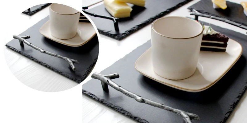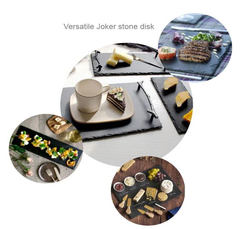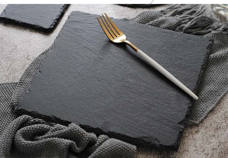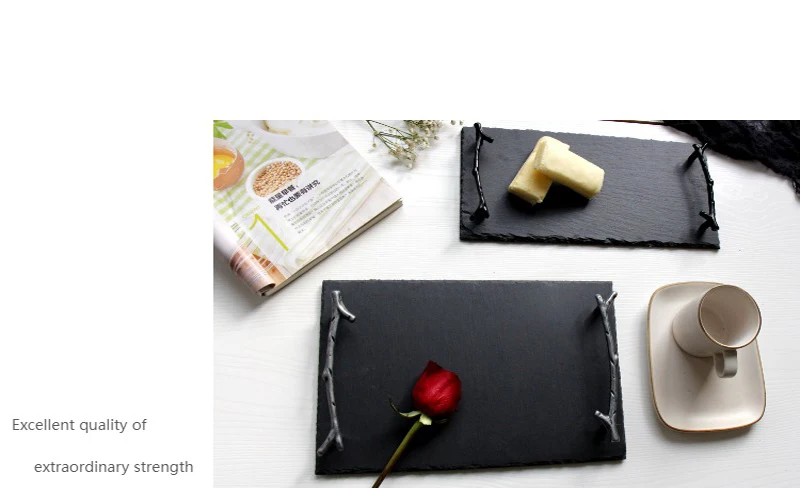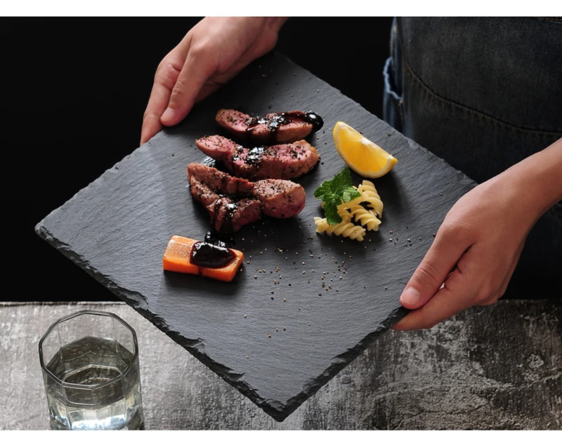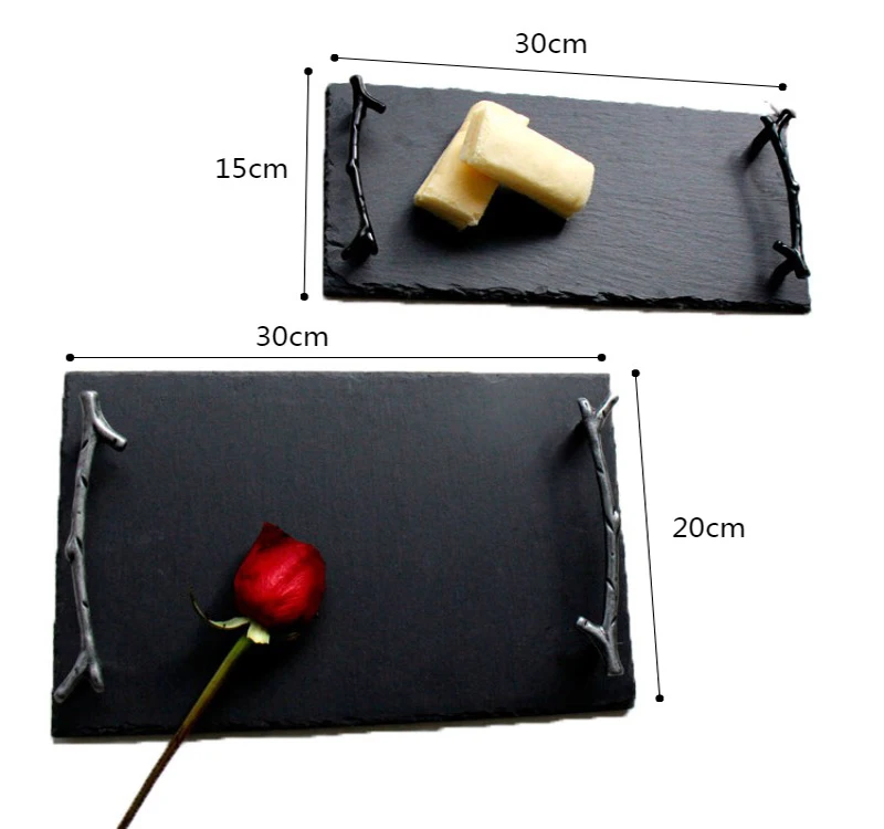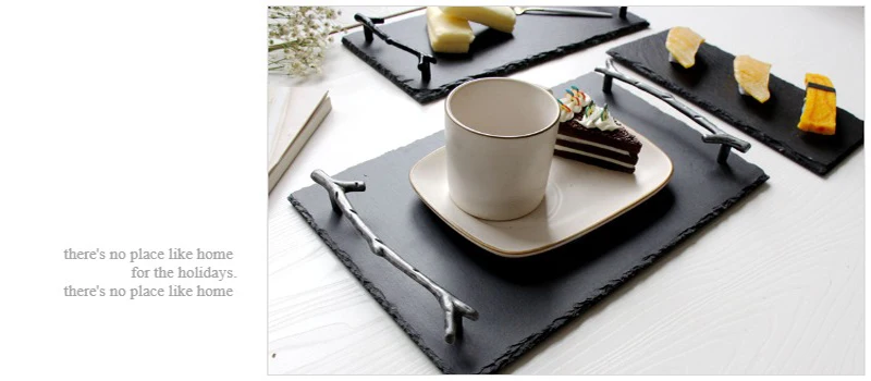 Металлическая ручка, Западная натуральная тарелка из сланца, твердый квадратный камень, суши, стейк, барбекю, тарелка для сыра, пиццы, плоская тарелка для фруктов, поднос для еды