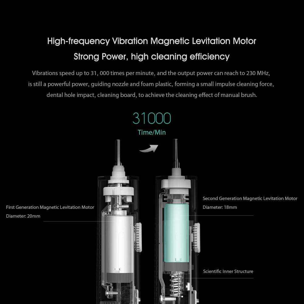Высокочастотный мощный двигатель обеспечивает глубокое очищение, скорость вибрации до 31000 раз в минуту